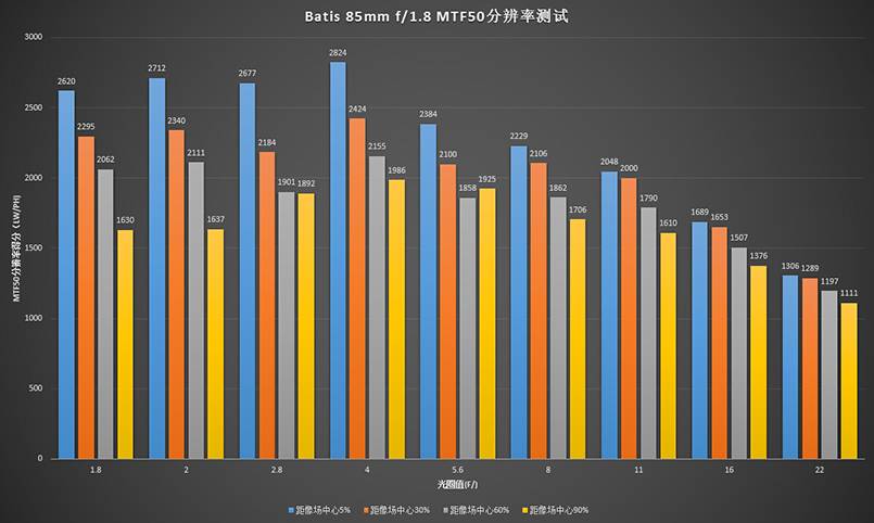 在搭配索尼A7R2相机(4200万像素全画幅传感器)的情况下对Batis 85mm f/1.8镜头进行测试,分别截取距像场中心5%、30%、60%和90%位置处的数据,以反映该镜头像场内不同位置的分辨率水平。