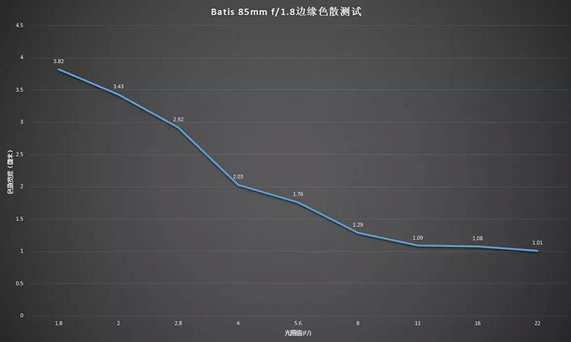 在全开光圈、像场95%处Batis 85 1.8的色散也不到4μm,色散控制堪称优秀。