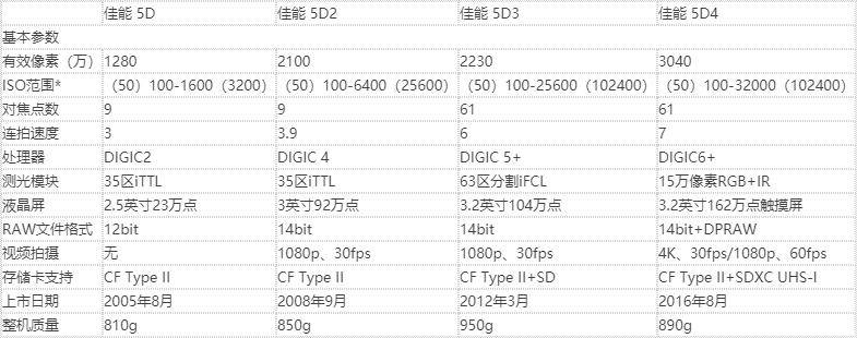好了废话不多说,这次的主题是佳能5D系列1、2、3、4代的对比测评,自然要先对比一下它们的规格: