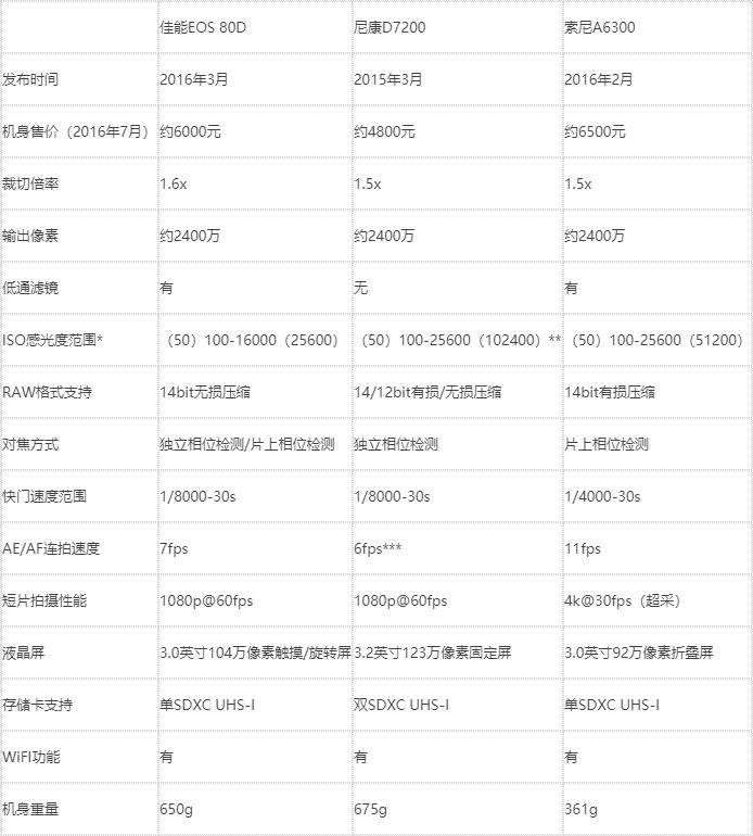 A6300和80D是今年的新产品,D7200则显得稍稍有些老——2015年3月份发布,早了整整一年。因此在一些功能方面也有所缺失,具体的规格对比可参见下表: