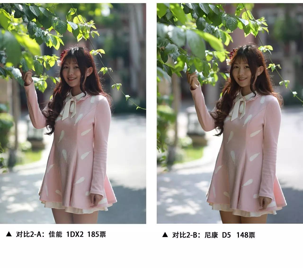 可以看出,佳能 1DX2在人像模式下确实扭转了标准模式色彩寡淡的问题,肤色呈现出漂亮的粉红色。后期稍微提亮一点,就能出现白里透红的漂亮皮肤。很多人可能都知道,在树叶,草地等绿色环境,相机的白平衡可能会出问题导致人像肤色发绿。在对比2 这组靠近树叶的照片中可以看出,佳能 1DX2在绿色环境下白平衡明显更加准确,基本上完全没有绿色的感觉,而尼康 D5的模特脸部就透出一种难看的绿色。