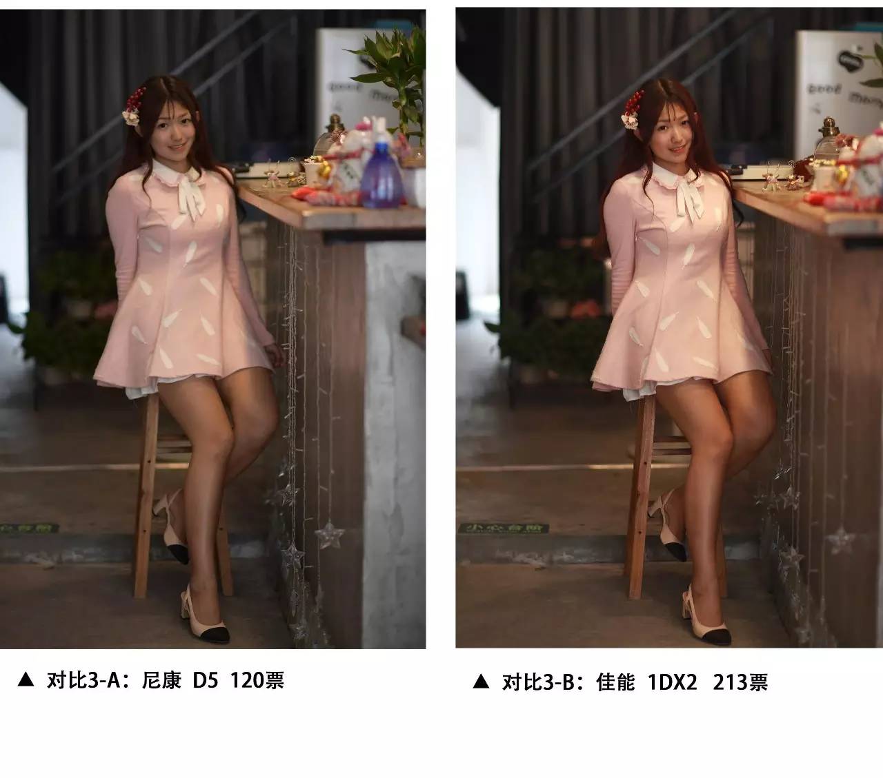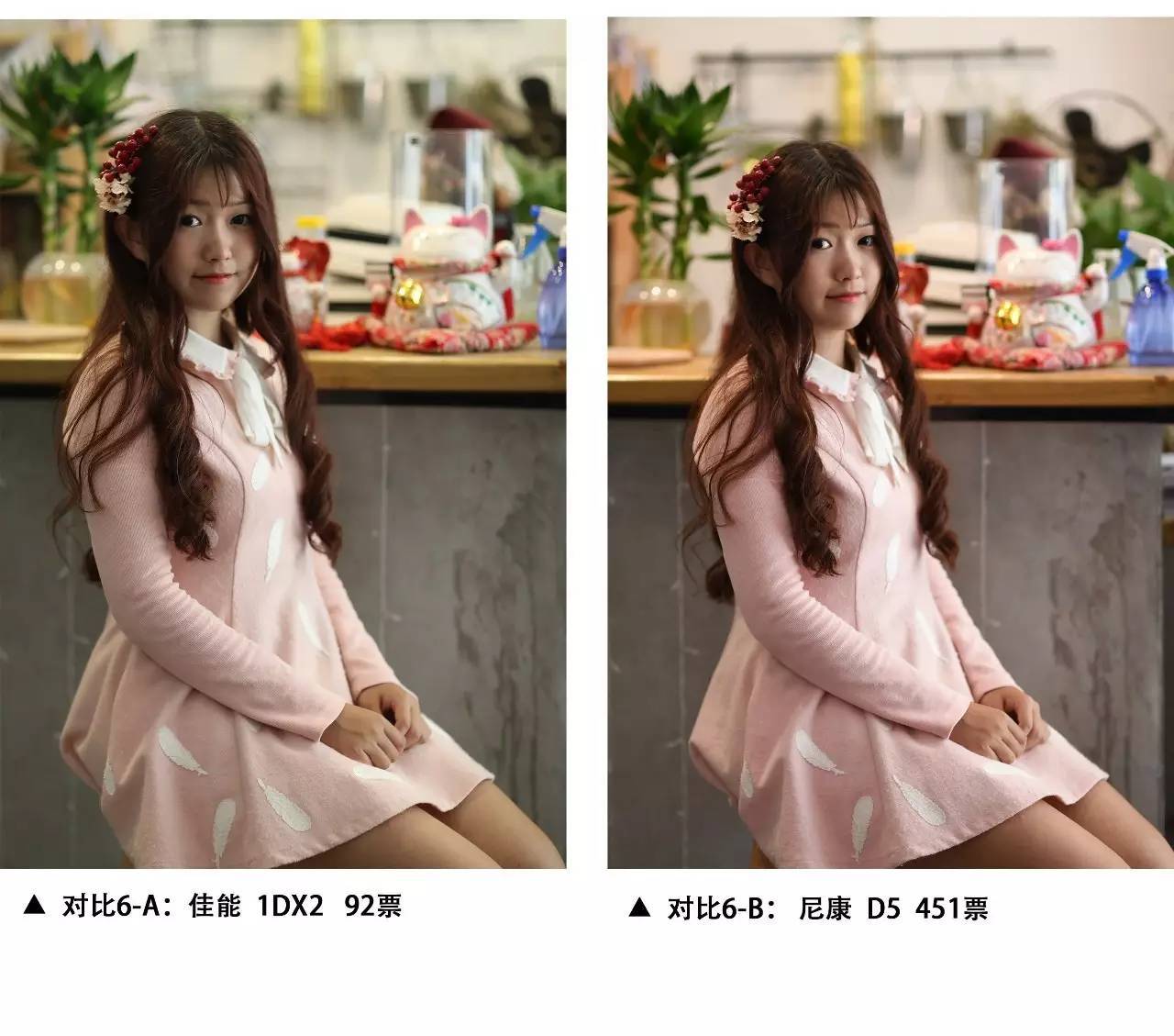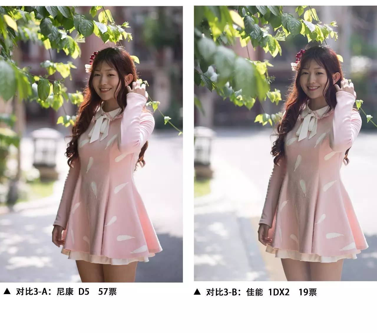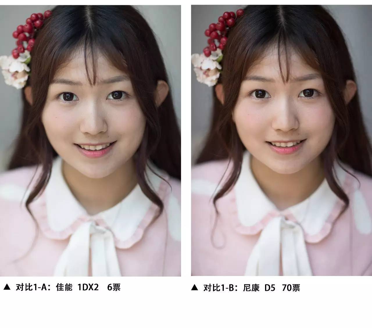 观察一下使用ACR默认设置转换成JPG的样片,可以看到尼康 D5的照片在保持整体较高饱和度和反差的情况下,肤色也更加红润有光泽。而佳能 1DX2的表现其实也不错,肤色白净,反差略低(这是成像风格,不算优劣),但是和尼康 D5比较的话,大家的投票已经告诉了我们答案...