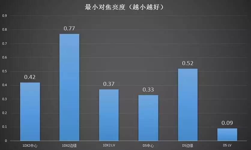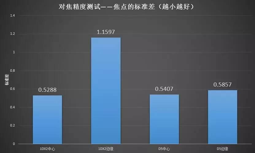 1DX2的中心对焦点表现优秀(所谓的双十字对焦点稳如狗?)但是边缘表现实在是有点糟,不光标准差达到了1.1597,位置的极差也是最大的,达到了±3(D5最多只有±1.6)。而D5的新对焦模块虽然极限表现不如1DX2,但是胜在稳定,大光圈镜头搭配边缘对焦点依然有着很不错的可用性。