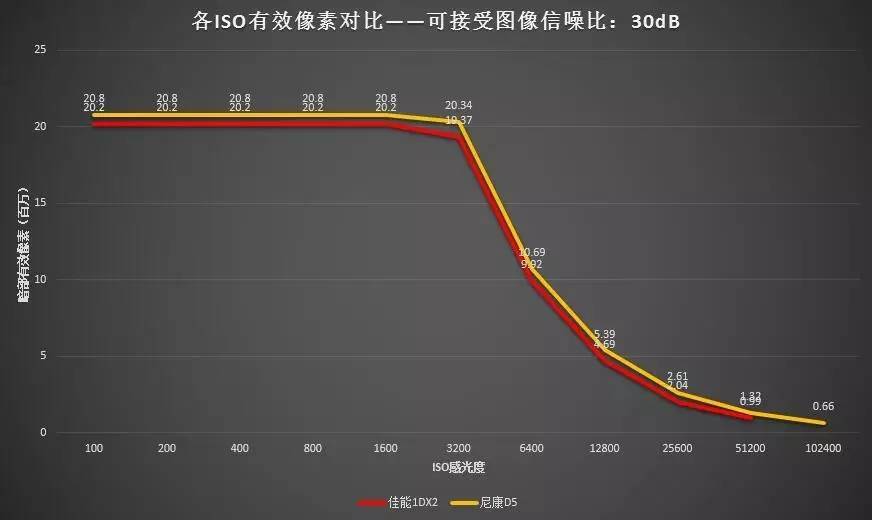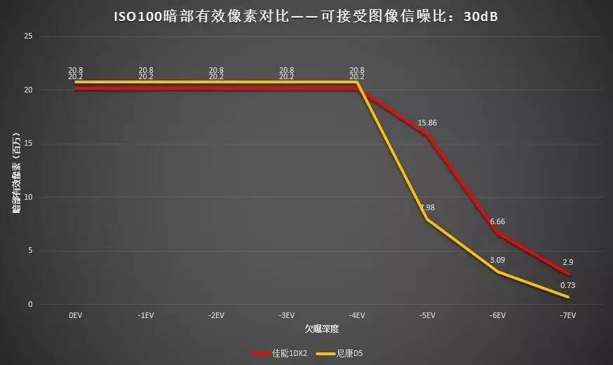跟动态范围测试结果的一边倒相比甚至还有点微妙,尼康 D5在欠曝3EV以内的条件下不输甚至还稍微领先于佳能1DX2(参见40dB下的有效像素数值)。但一旦欠曝深度大于等于4EV,内置ADC架构低本底噪声的优势便一览无余,甩开尼康D5大概1倍有余的可用画质。大家可以根据自己对图像画质的要求,选择适合自己的参考标准来进行查看对比。