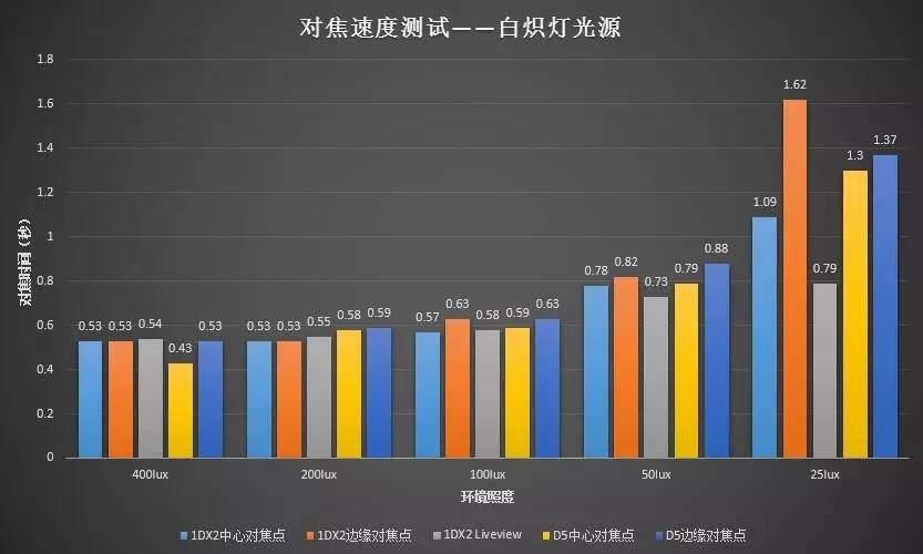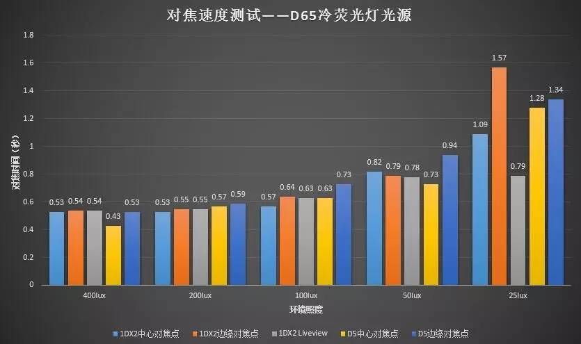 从不同照度性能结果上看,光线好的环境下(400lux大概是白天室内的照度,室外那种几千上万的环境下相信更体现不出任何差距)两款机身都能有相对稳定的对焦发挥。最快的是尼康 D5的中心对焦点,仅需0.43s便完成合焦,相比其他对手快出将近20%,是个不错的表现。