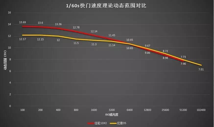 按照动态范围定义(最大不失真输出功率/零输入响应)对两款机身的理论动态范围进行测试。在像素和画幅相同的前提下,动态范围和实拍宽容度存在很好的正相关。
