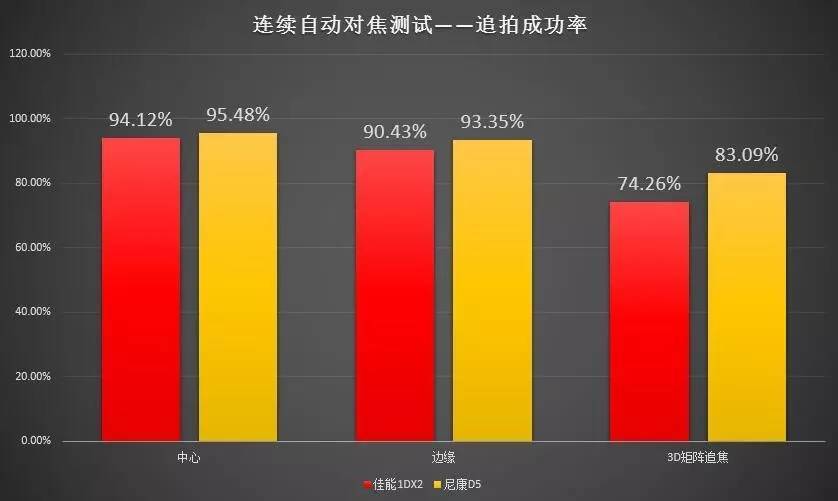 在连续自动对焦这块上尼康 D5还是略强于佳能 1DX2,无论是中心点还是边缘点,尼康 D5的成功率都比佳能 1DX2更高。并且和单次对焦精度类似,尼康 D5的边缘点表现比佳能 1DX2更好。