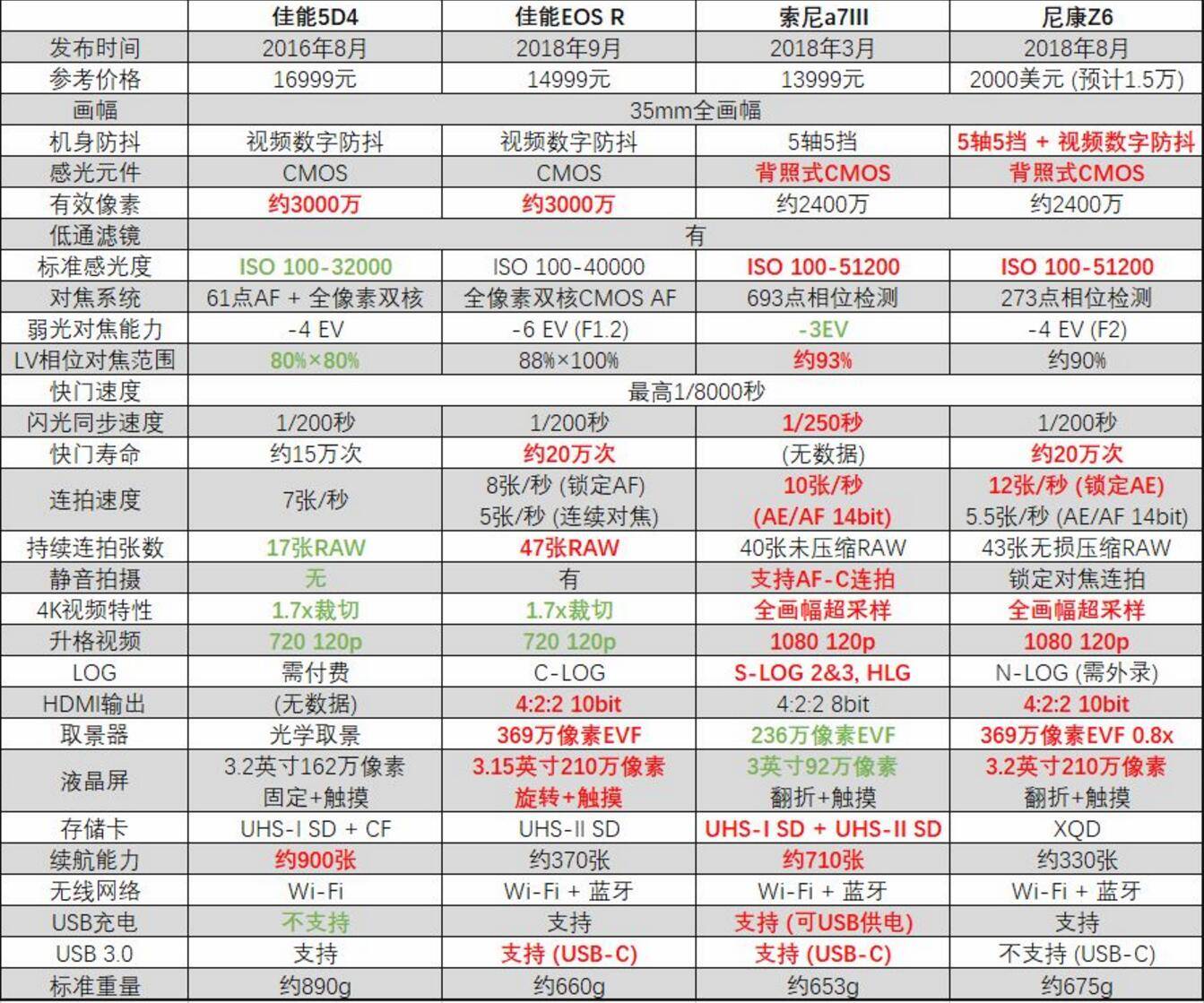 这里给出佳能EOS R与同门5D4,近似价位全画幅微单索尼a7III、尼康Z6的对比。