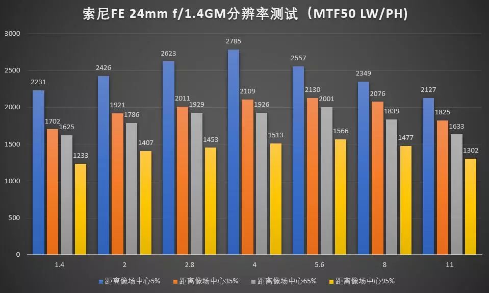 从数据上来看FE 24mm f/1.4GM符合G大师镜头的一贯表现——即使考虑到矫正桶形畸变会导致中心区域图像压缩,矫正之后中心分辨率反而有可能提高这个因素,也比f/2.0的Batis 25/2表现要好一些。小光圈拍摄风光时到了95%区域画质才开始明显衰减(而且也不差),作为风光头也完全OK。整体来看镜头的最佳光圈是f/4。