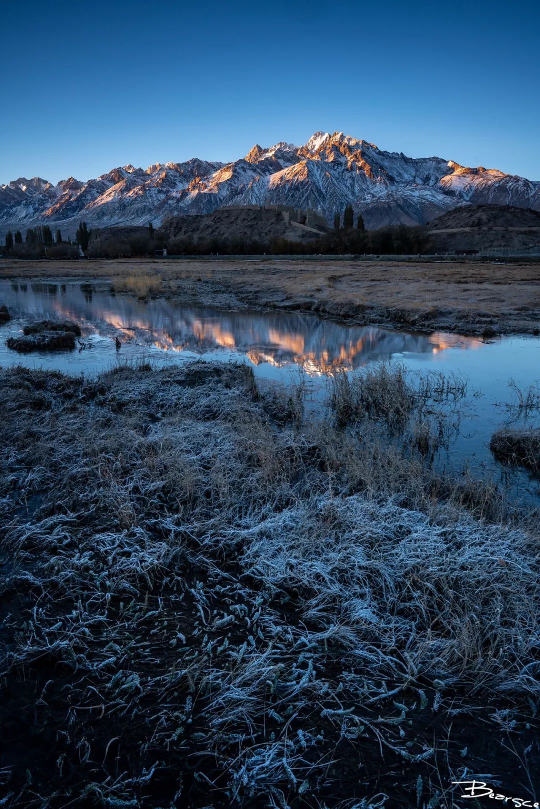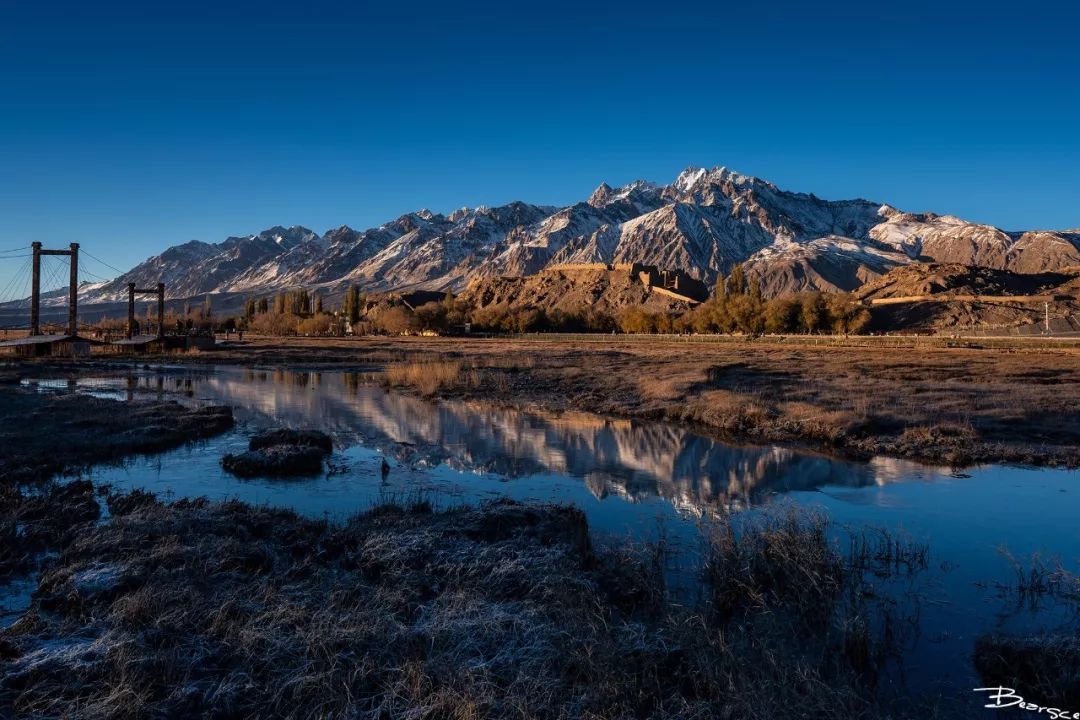 以雪山为背景的石头城日出,也算是经典的风光打卡照了,这个机位每天都会聚集很多摄影爱好者。因为在金草滩上正好有一汪溪水,可以拍摄倒影。在这个机位拍摄还是横构图比较合适,但是竖构图可以拍到前景一片霜打的枯草,也是不错的选择。