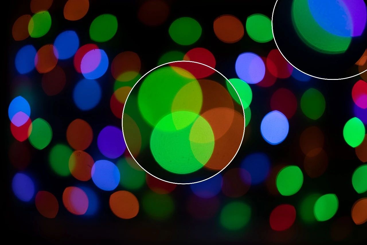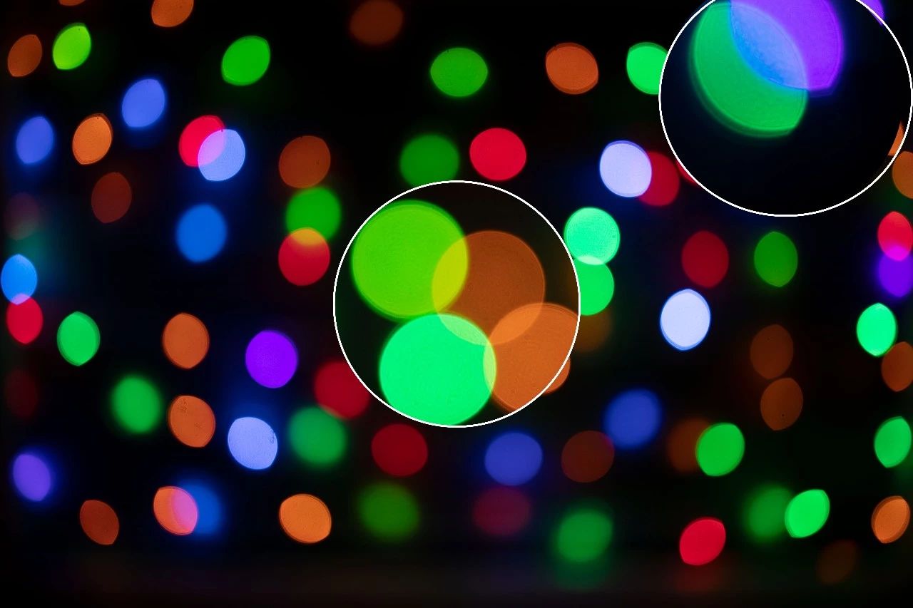这次我们换了一个带框的灯条,这样的话光斑排列就规整多了。针对框是一个平面,没有纵深的问题,我们拍摄大小两张光斑图来反映这支镜头的焦外表现: