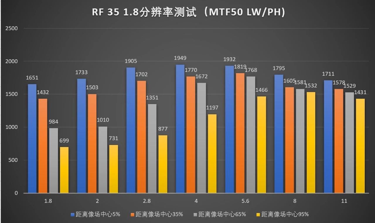 全开光圈下这支镜头的分辨率表现尚可,中心部分画质OK但是边缘不算太尽如人意。收缩光圈之后中心画质提升不明显,极限也只有1950LW/PH,相比之前测试的RF 50 1.2L明显不如——但是考虑到这个体积重量和定价以及焦距不同似乎也没什么。考虑到这支镜头实际使用时对于分辨率表现的需求来结合跑分做判断的话,我觉得这支镜头的画质表现满足日常使用需求没什么问题(毕竟全开光圈的极限边角基本都在焦外)。