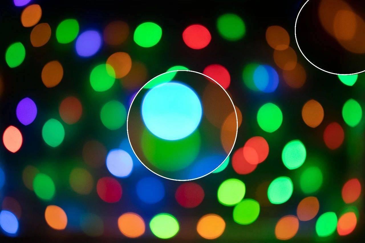 焦外光斑表现方面整洁度尚可,但是短波(蓝紫色)的光斑边缘存在明显的亮边,口径蚀也比较明显。