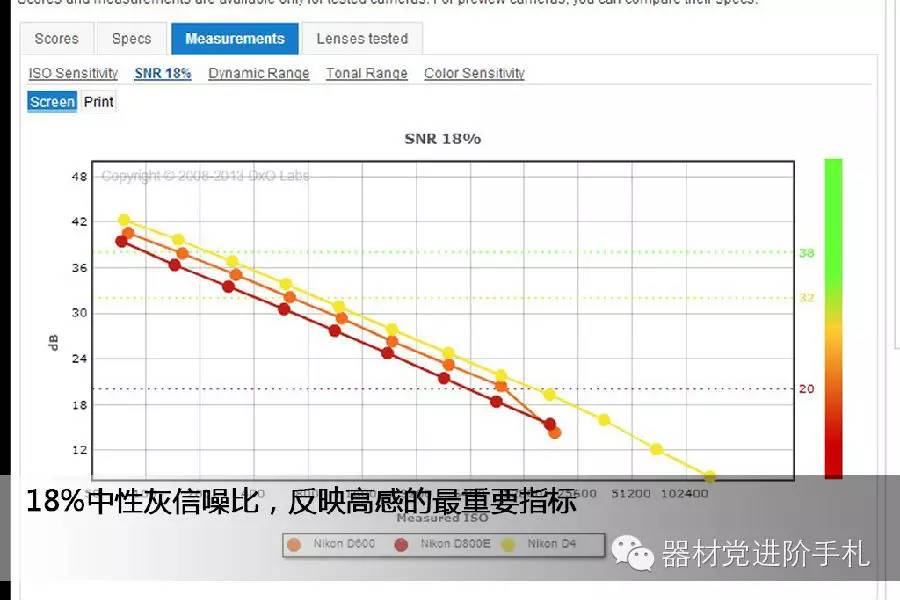 2、实测信噪比时,可以通过单张灰阶卡不同区域取样计算来获得不同亮度区块的输出信噪比——是的,按这个方法,测试出来的结果叫做动态范围,是现今反映传感器风光摄影画质的最重要指标。