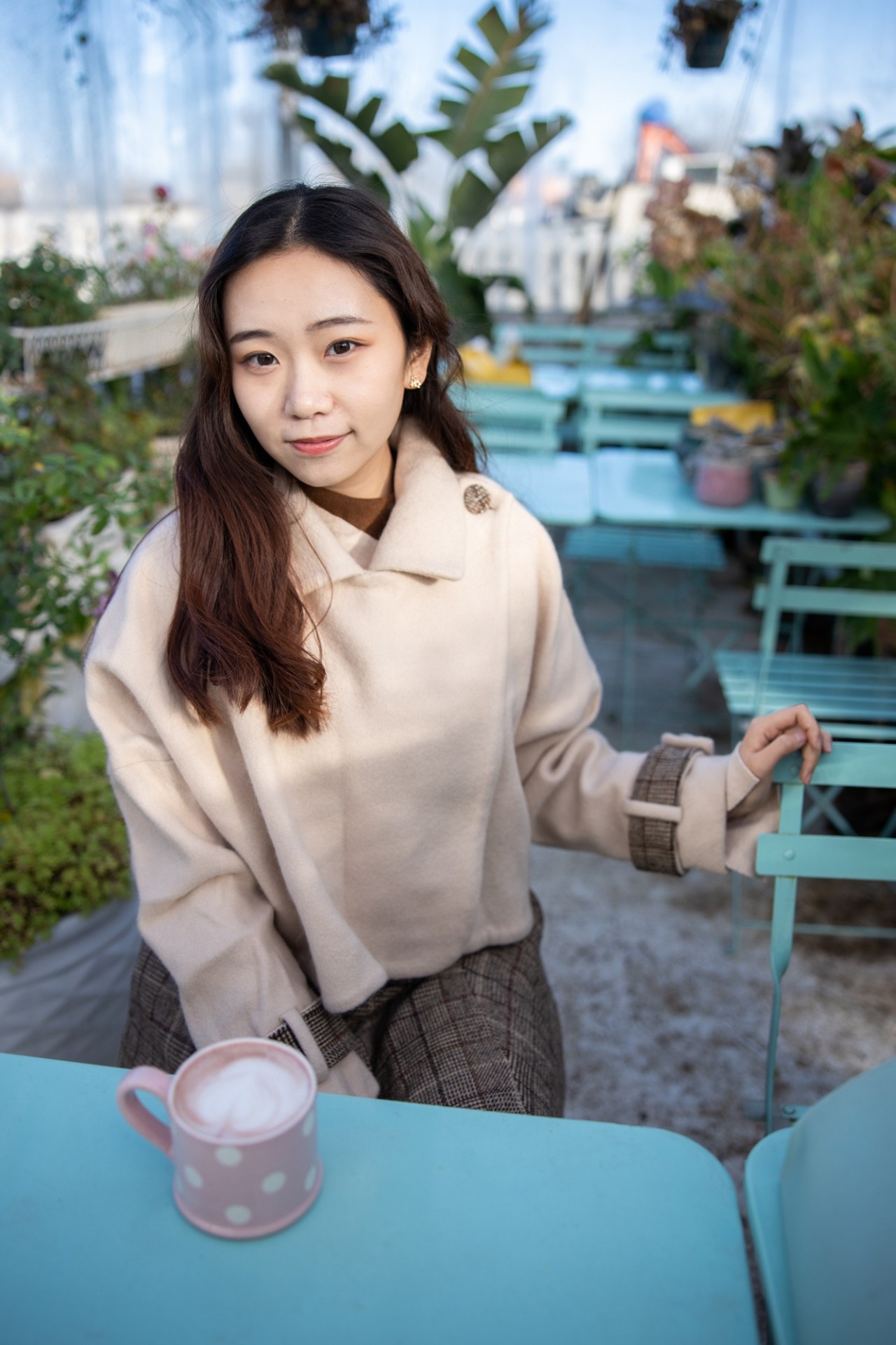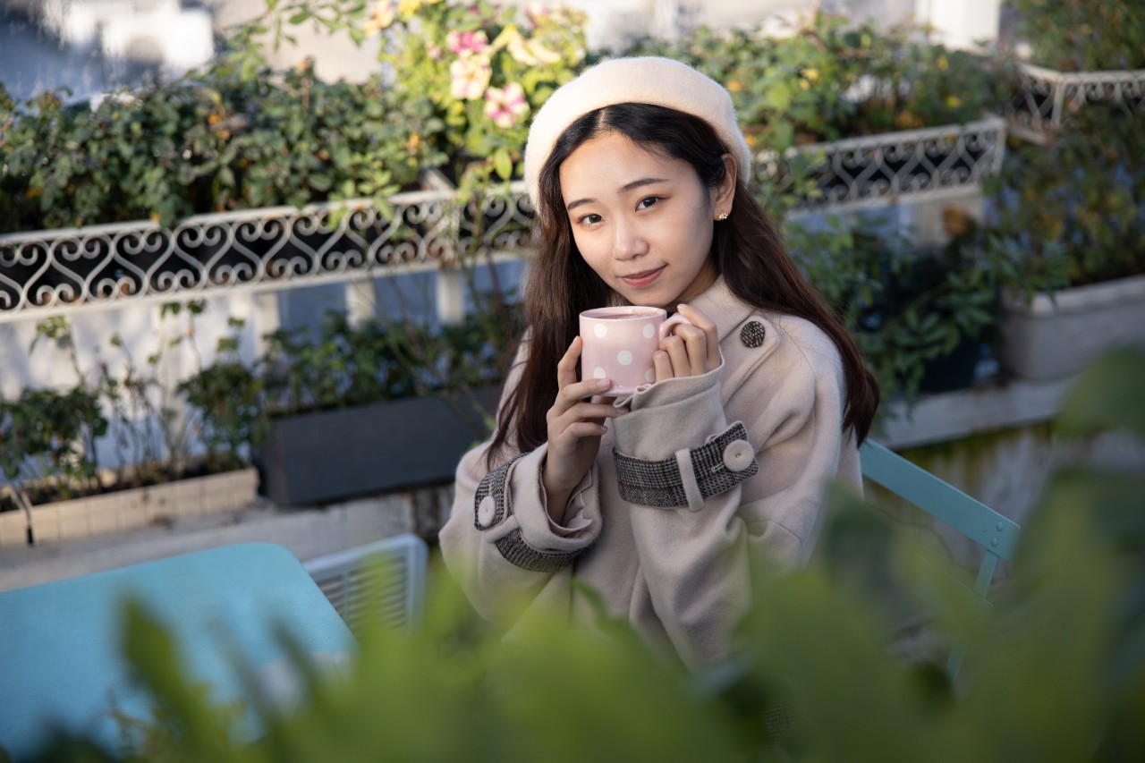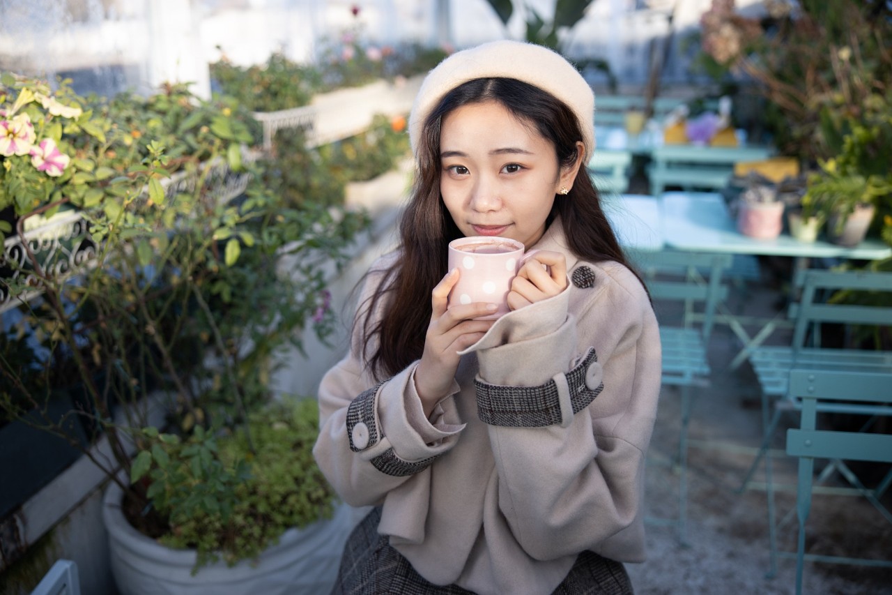 找点小道具:直接拍总会有点单调,冬天时手难免有些僵。抱一杯热巧克力,模特会很开心。