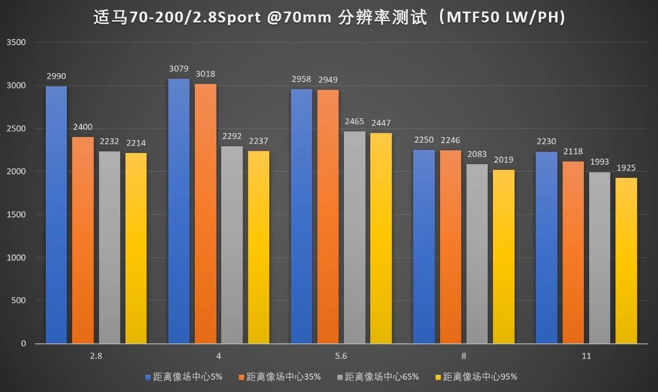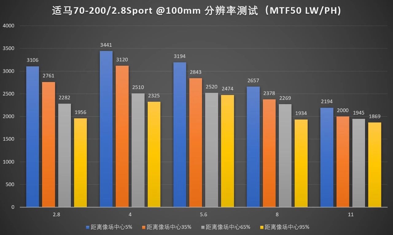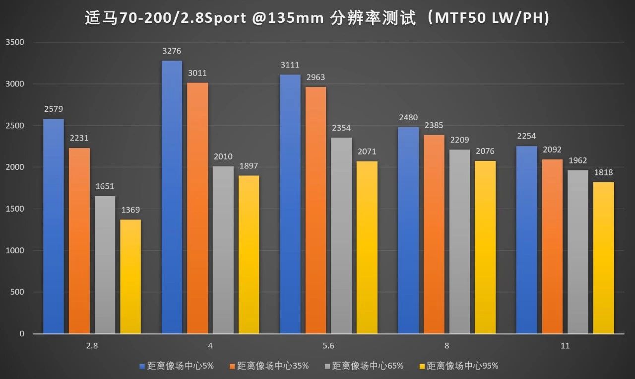 作为一支f/2.8光圈的变焦镜头,这个分辨率表现还是相当可以的。跟佳能的小白三、尼康电磁炮和索尼70-200GM相比大部分的焦段、光圈和位置数据都有优势,最强长焦大三元的地位再度易主。就数据本身内部比较而言,这支镜头相对较弱的两方面一个是边缘画质一个是小光圈画质,但考虑到对于这种规格的镜头来说边缘都在焦外,小光圈用得也不会太频繁,都还算可以接受。焦距方面两头略强中间略弱,也符合这支镜头一般而言的使用习惯。