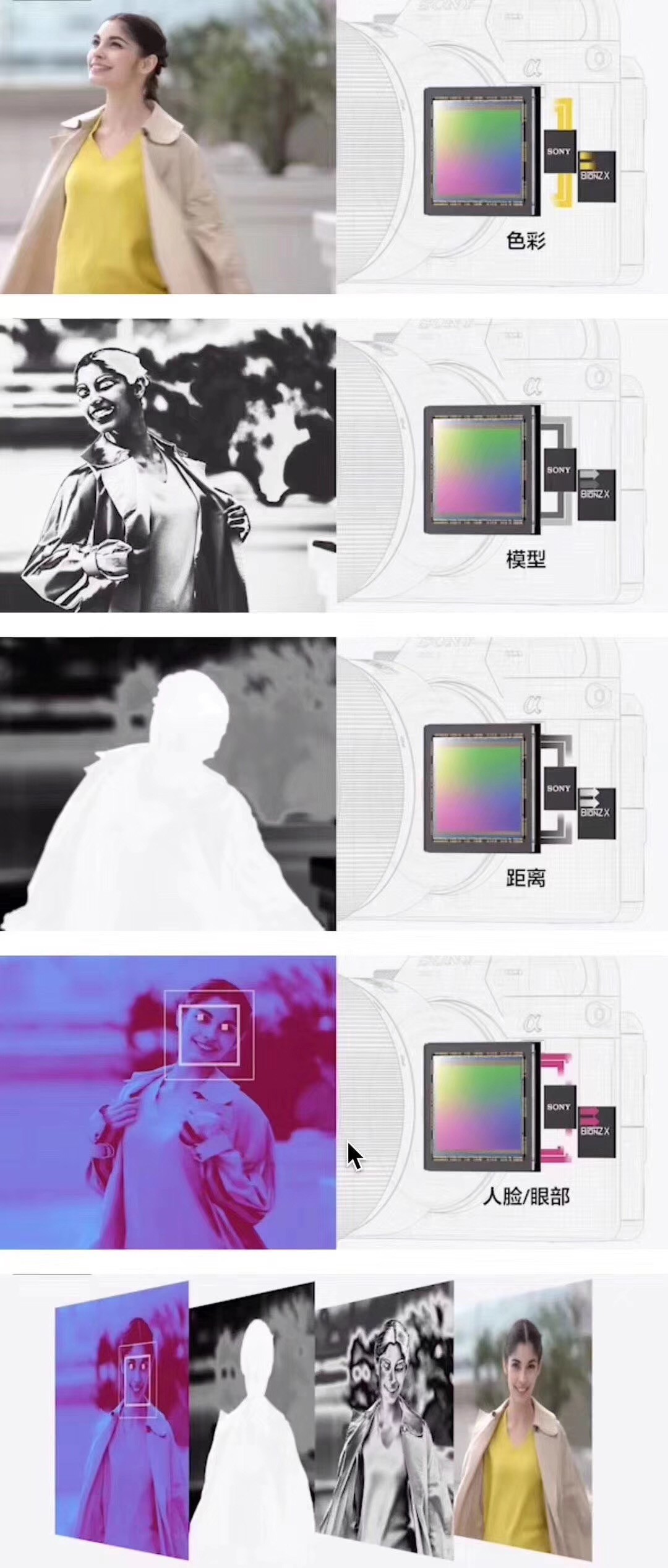 A6400借助与索尼A9相同的BIONZX影像处理器对被摄体的颜色、图案、距离、面部、眼部进行分析,基于影像处理器、数据库、算法的三者协作,从而实现了兼顾以上四项要求的“实时追踪”AF功能。