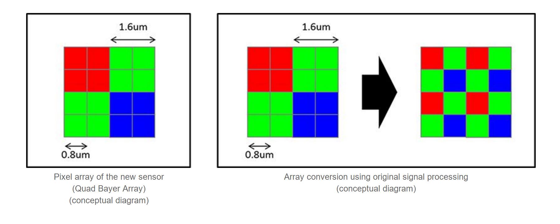 我们前面说了,对于手机CIS来说,与手机ISP的配合是非常重要的。这两种传感器的Quad-Bayer属于特殊排列,但绕不开的问题是由于拜耳阵列占据了多年来的绝对主流,现在绝大部分的手机ISP都只认Bayer而不能直接识别Quad-Bayer输出的信号,在下一代原生支持Quad-Bayer的ISP出现之前,这两块手机CIS都是通过被叫作“Remosaic”的的方式,将Quad-Bayer信号转换成标准拜耳阵列,给手机ISP进行处理。