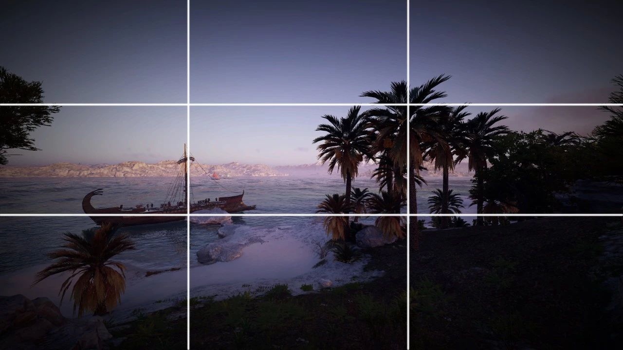 而除了景点的三分法,棋盘构图也是很实用的,从下图看游戏中也很好的模拟了大光圈的效果。