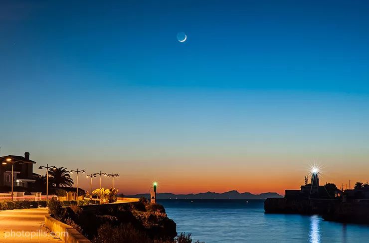这时候太阳已经落下水平线,但余光还未消失,天空呈现冷暖过渡的色调,也十分合适拍摄月亮。
