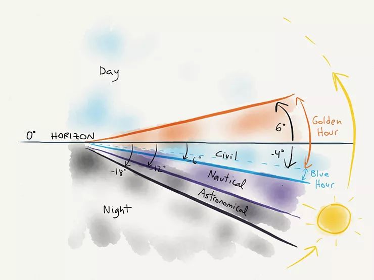 那么Golden和Blue Hour的定义是什么呢?由于两者出现的时间会因位置和季变化,所以准确的做法是计算太阳与水平线的相对度数,然后再换算时间(日出和日落的计算相同),详见下图:
