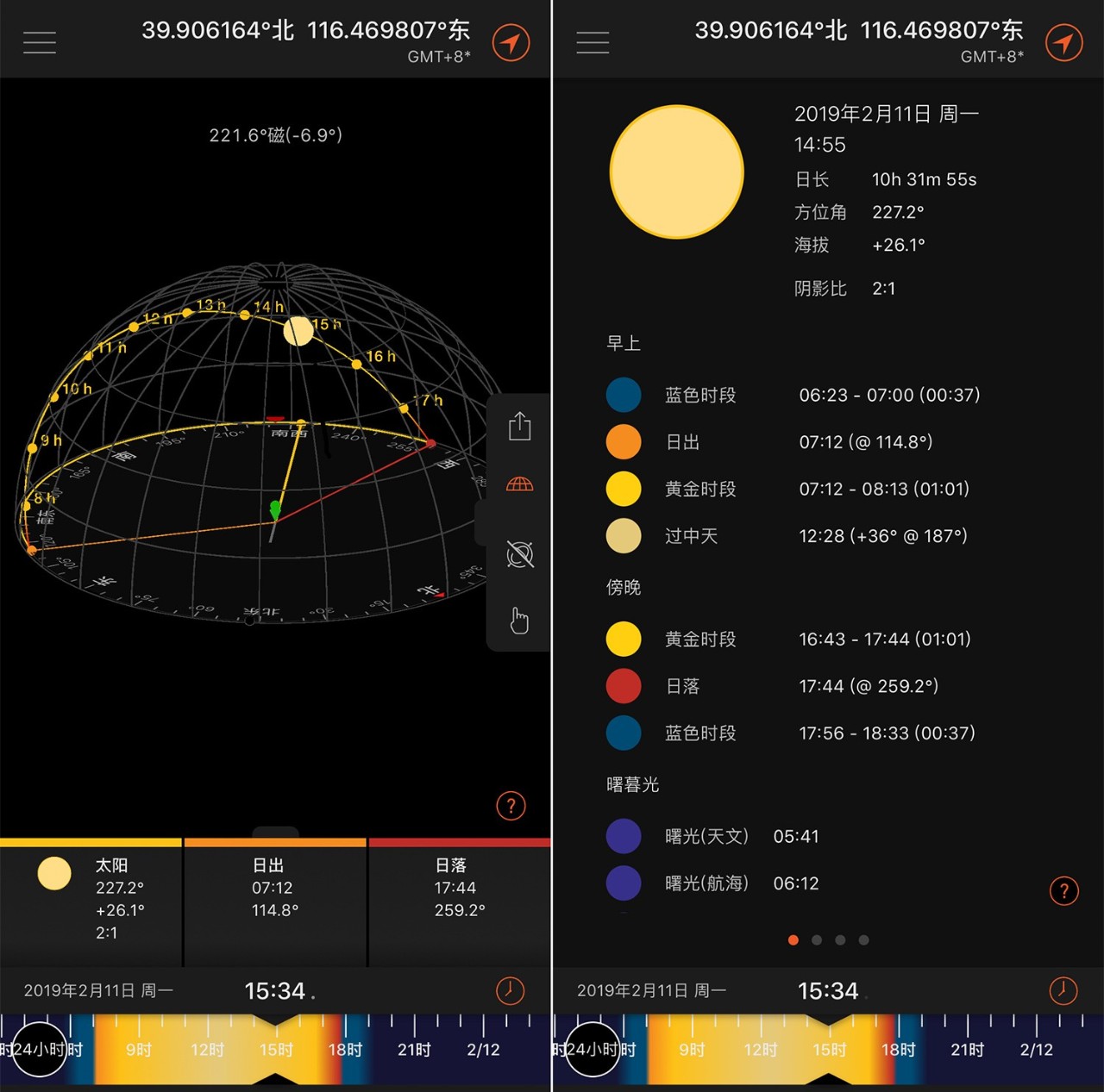 打开这个软件,你可以看到所在地当时的太阳运行轨迹。也可以点击左上角按钮选择详细信息,查看当天的Magic Hour时段(黄金时段、蓝色时段)的持续时间。