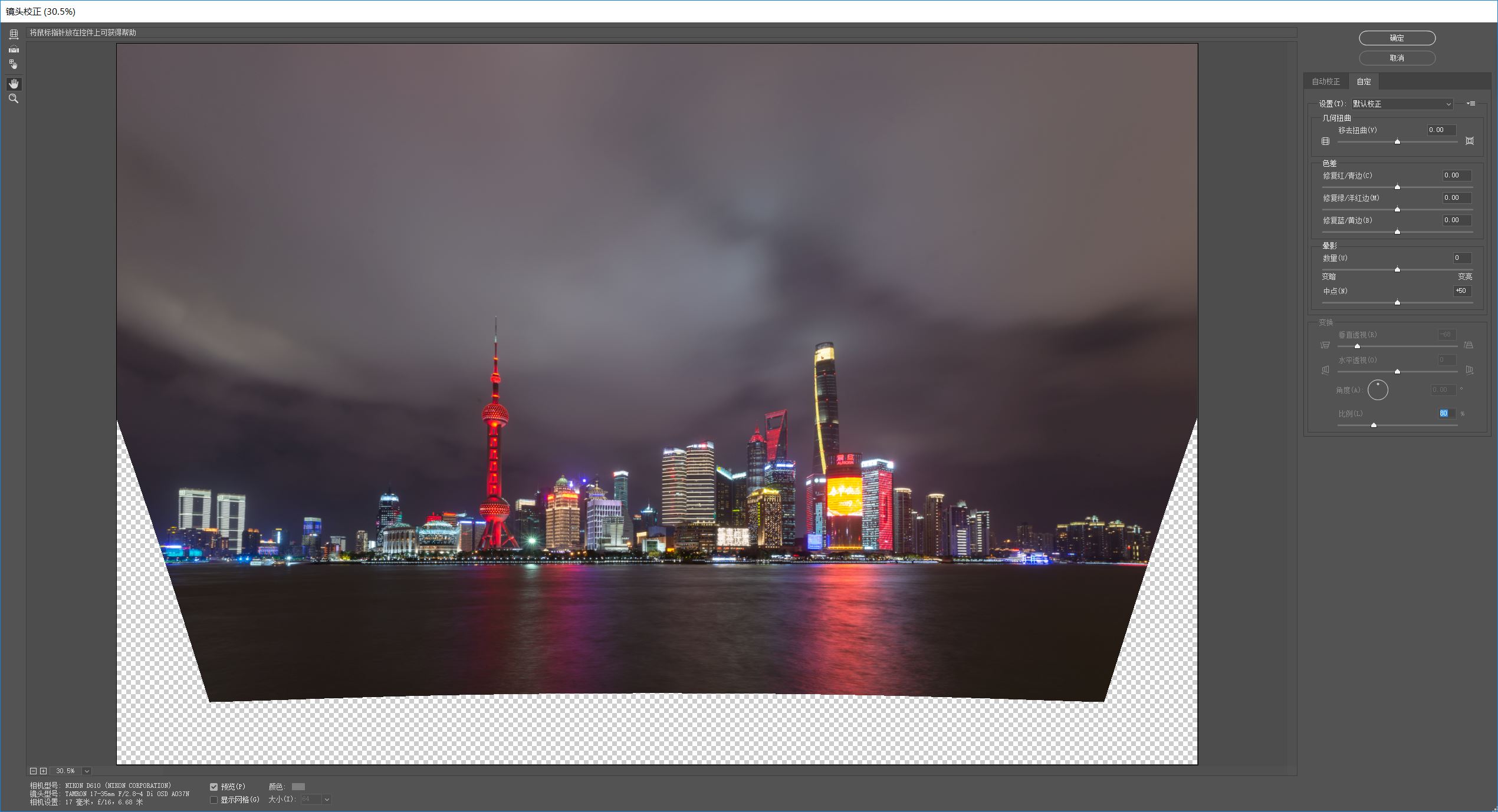 水平透视则是改变照片x轴的角度。这张照片是正对着陆家嘴,没有水平方向的变形,就不需要调整水平透视了。