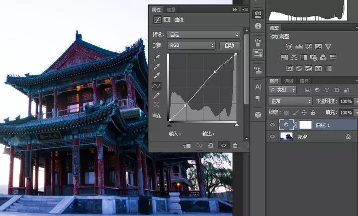 然后我们对第二张照片进行调整,主要的工作就是进行色彩控制。稍微调整下曲线控制下曝光与反差如下图: