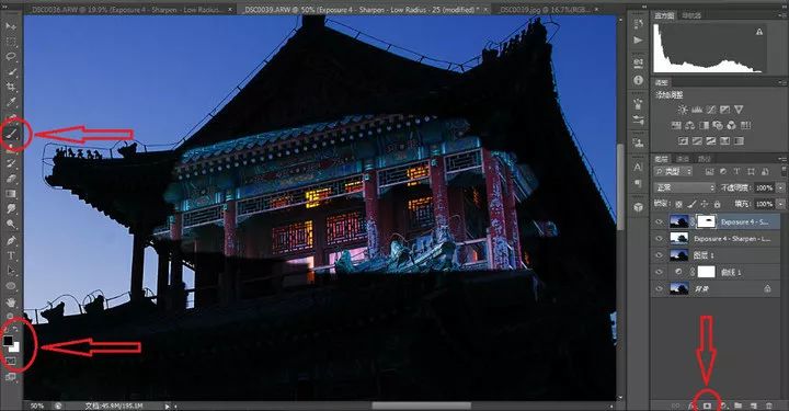 所有的注意事项均在图上标出,蒙版选择在右下红圈处,选用画笔工具,颜色黑色,在图上擦出下面的建筑物即可,这里我已经擦了一部分了。如果你不小心手滑擦多了,颜色翻转选择白色,重新擦就好了。全部擦完就可以得到一张漂亮的照片,如果想更文艺一些,在“镜头校正”的晕影选项中减一些数值就好: