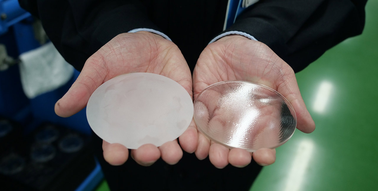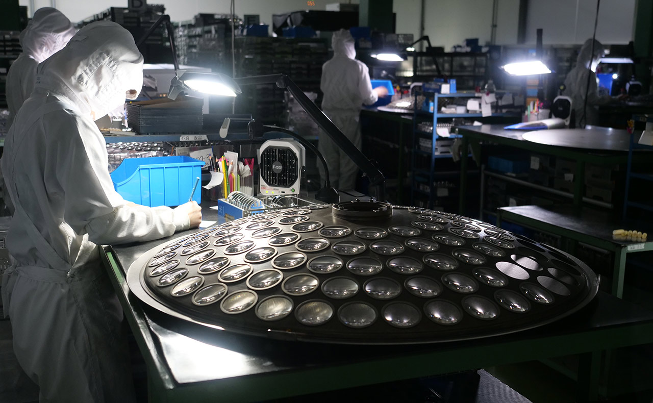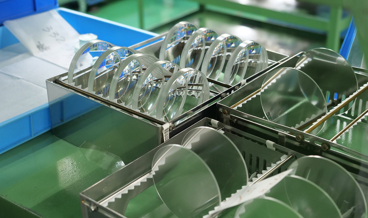 玻璃:原材料为比较粗大的镜片形状,经过三个阶段的研磨、切割、抛光加工而成为一片镜头中的镜片。每一个步骤都经过严密的监控,每一块玻璃都经过了彻底的检查。加工完成后的镜片再进行镀膜,其中一部分会通过UV硬化胶水粘合在一起,组装成一组镜片。这些步骤在一个干净密闭的房间里完成,我们没有进入,通过窗户进行的观察。