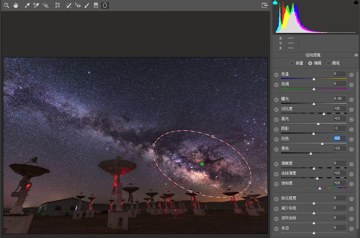 针对银心部分,我们还可以使用一个径向滤镜,对银心进行进一步的加强。