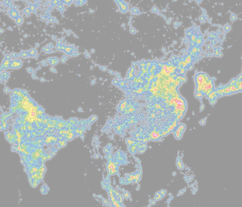 上图是中国的光污染情况。理想的拍摄地不仅要在灰黑色的区域内,还要离光污染较重的地方有一段距离,寻找起来还是需要一番功夫的。