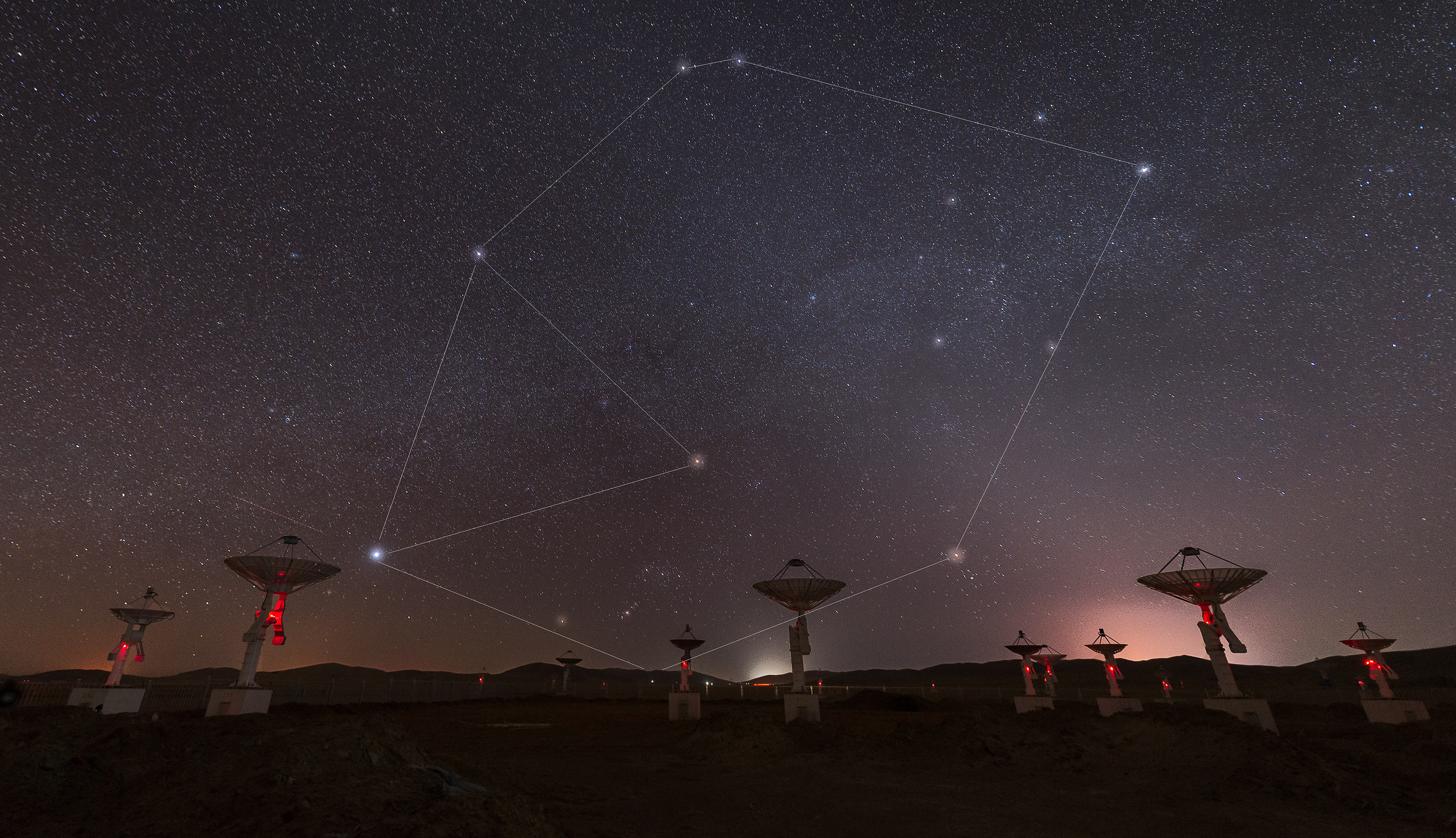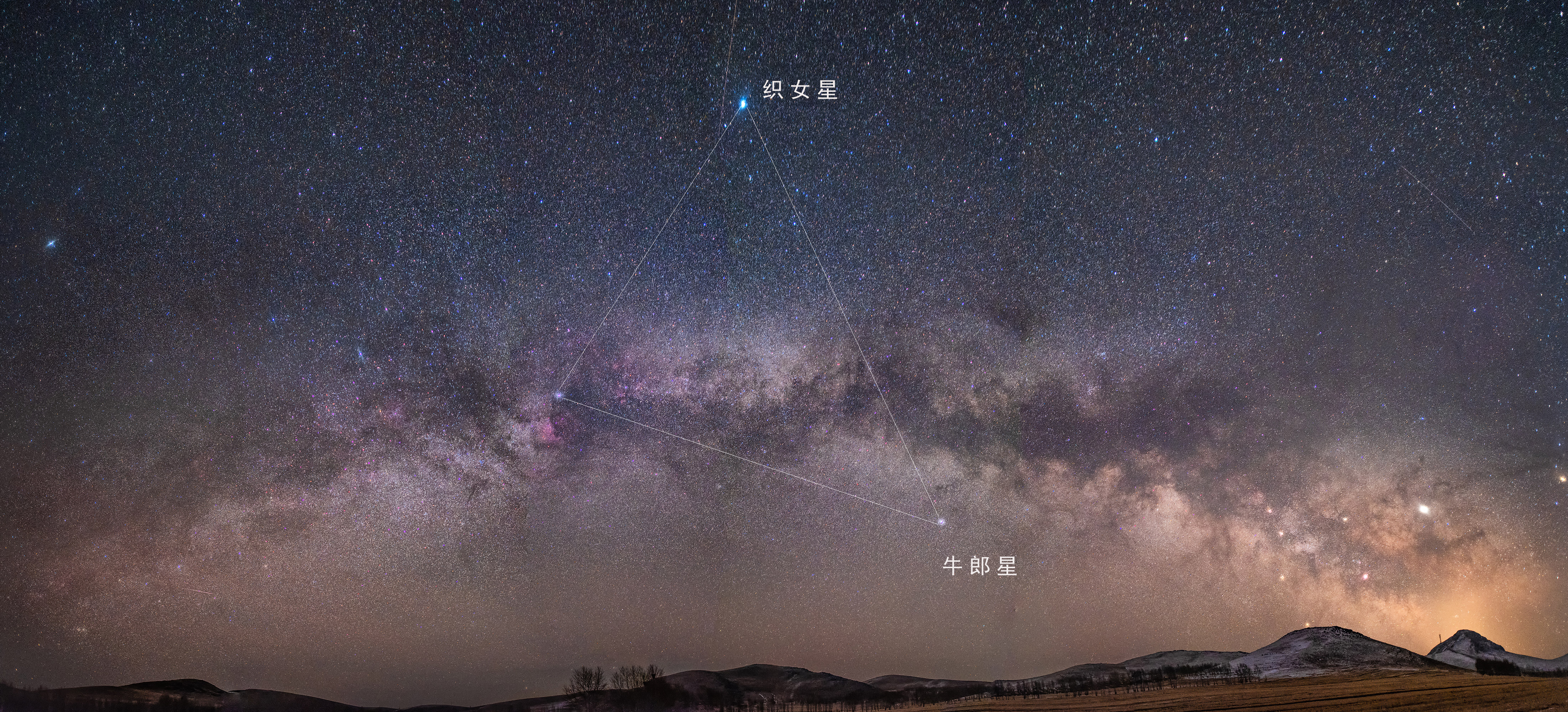 夏季星空的标志:夏季大钻石就在银拱之上。著名的牛郎星和织女星就是夏季大三角中在银河两侧的两颗星。