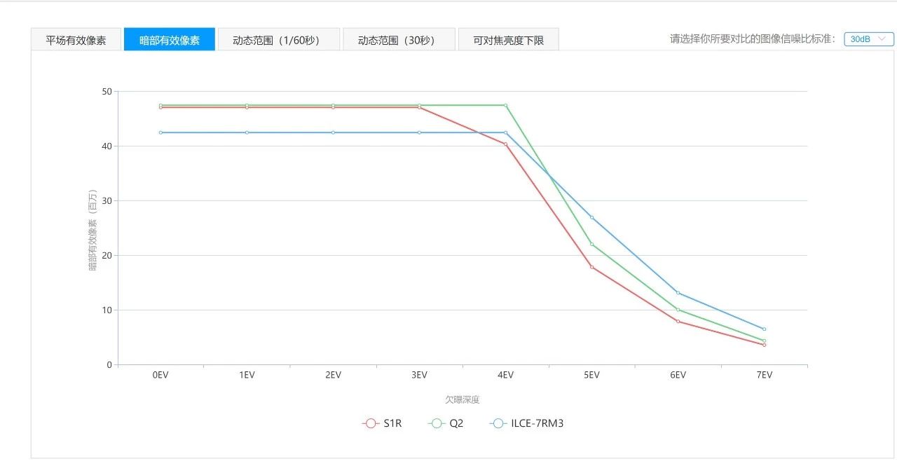 我们都知道单纯的动态范围只在画幅和量子效率相同的机身之间具有直接判定宽容度的价值,对于不同的传感器,实际曝光宽容度还需要进行测试。测试结果以“暗部有效像素”来表示,可以准确反映该相机能达到的实际宽容度。