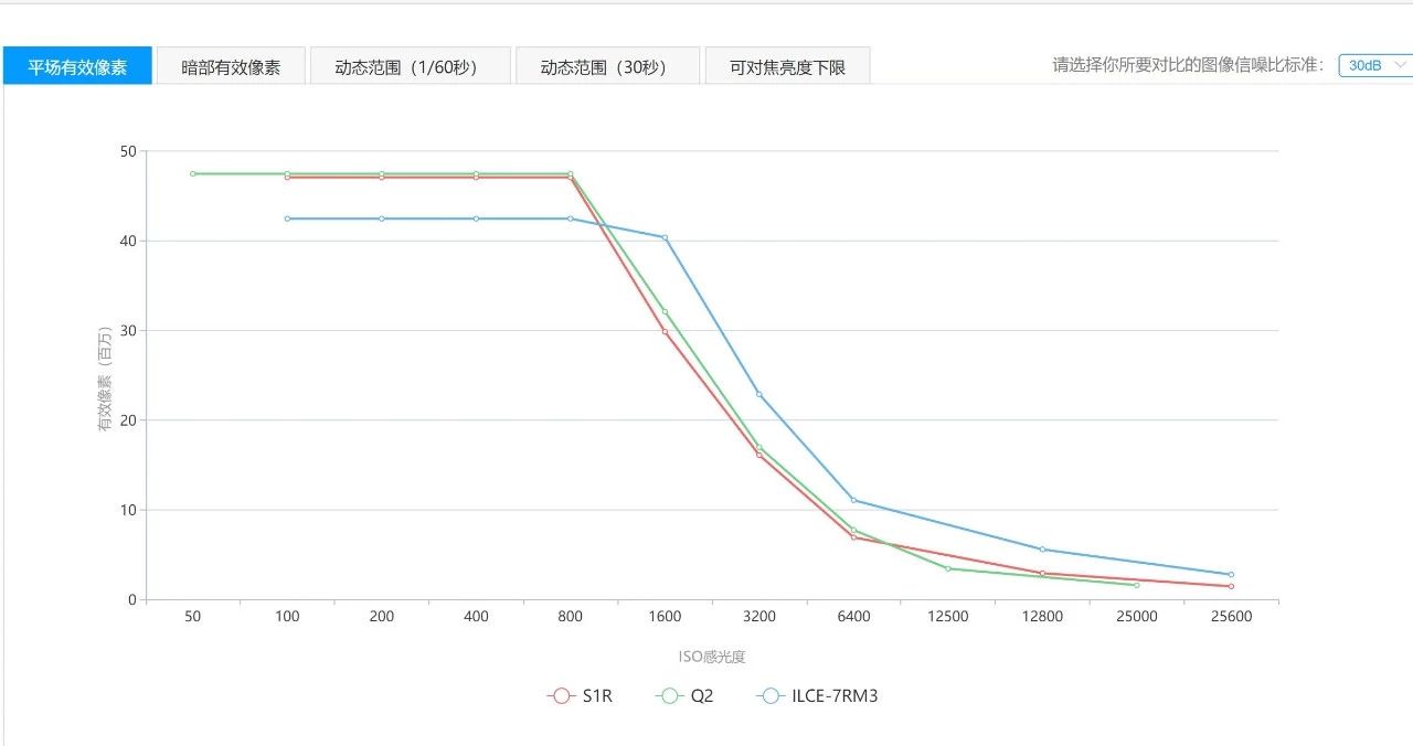 动态范围方面表现相比同为像素旗舰无反的索尼A7RM3有一定差距,同时相比同像素数量的徕卡Q2,S1R在标称ISO100下的动态范围跟Q2在ISO50下的数值相当。