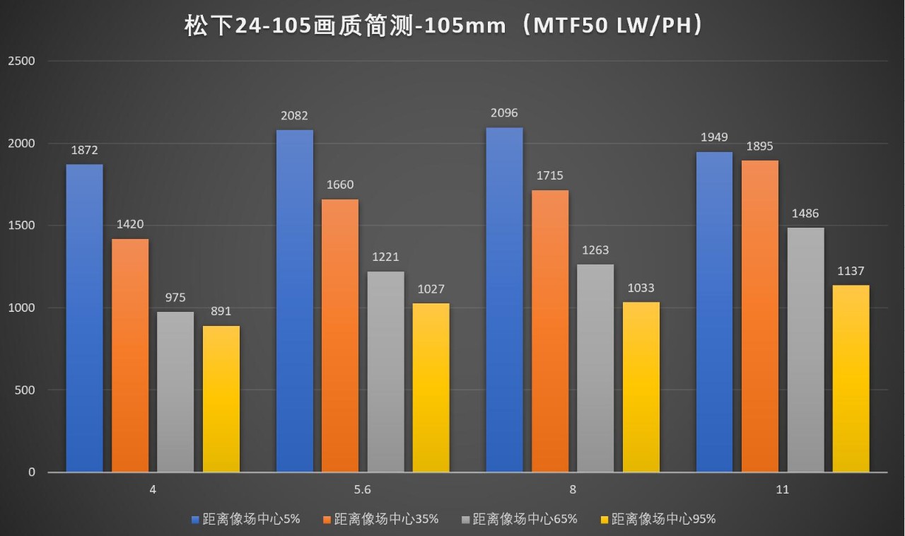 松下S1R这次首发的套机变焦镜头也是全幅常见的24-105mm f/4旅游标变,带光学防抖。受时间限制我们没有对它进行全面跑分,简单测试了下它两端焦距的MTF50分辨率: