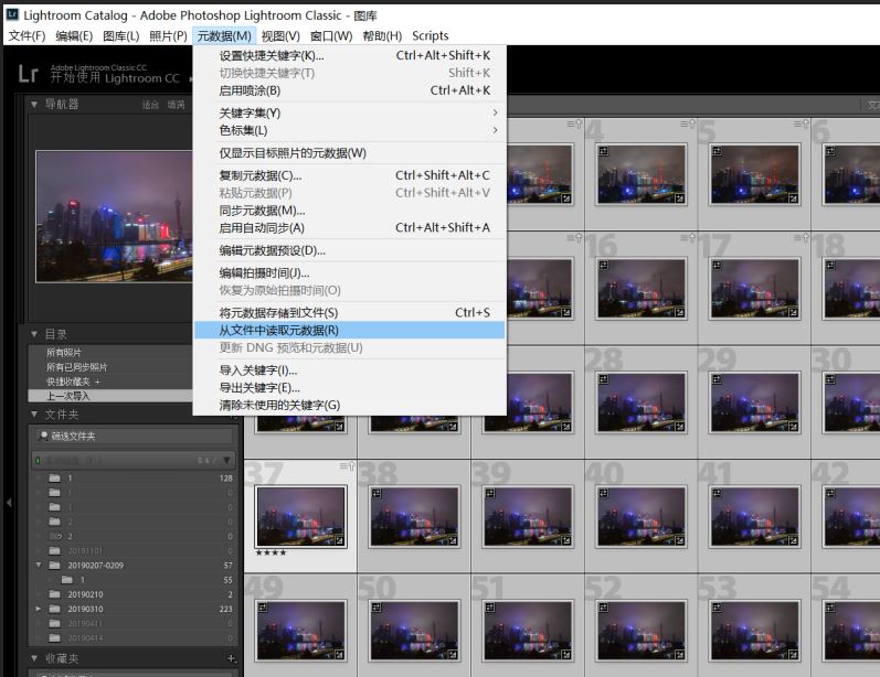 然后ctrl+A全选所有的素材,点击元数据——从文件中读取元数据