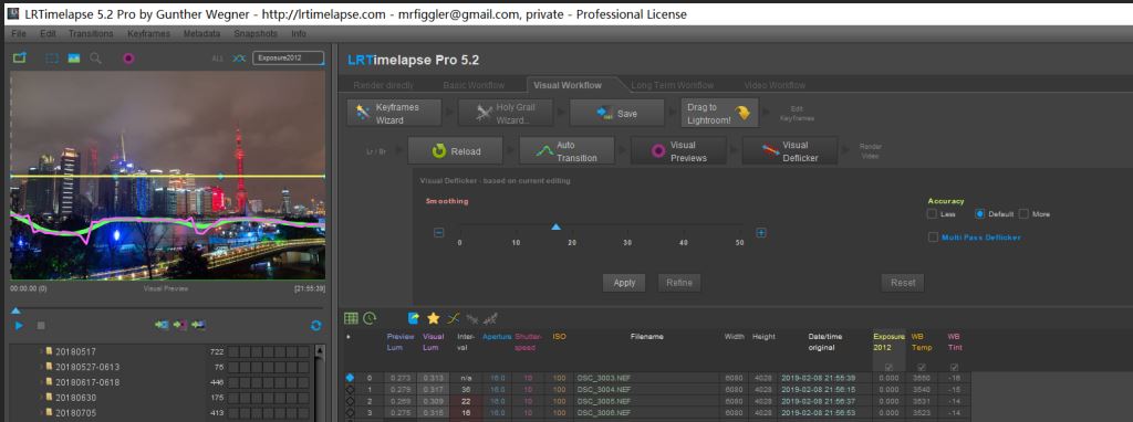 之后我们在LRT继续操作。我们点击auto transition-visual previews-visual deflicker,一路点下去就好。最后一步是去除延时中因为测光、环境等因素造成的闪烁,如果闪烁比较强的话我们可以拖动进度条来改变去闪烁的强度。