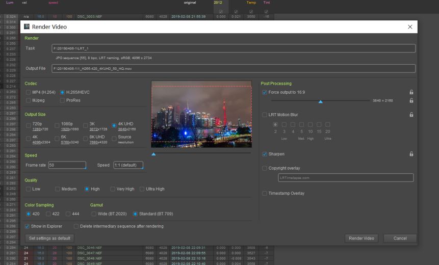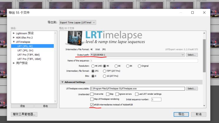 导出完成后我们再切回LRT,此时LRT会自动弹出最后的视频设置。选项有很多,需要调整的有视频分辨率、视频帧率、存储路径、裁切设置等,按需调整就可以了。