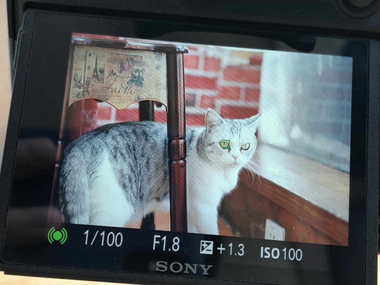 当开启“实时动物眼部对焦”这个功能后,如果相机能够检测到拍摄主体,拍摄体验与拍人像时几乎没有区别。下图中在喵星人的眼部处会出现绿框,表示识别到主体并对焦。