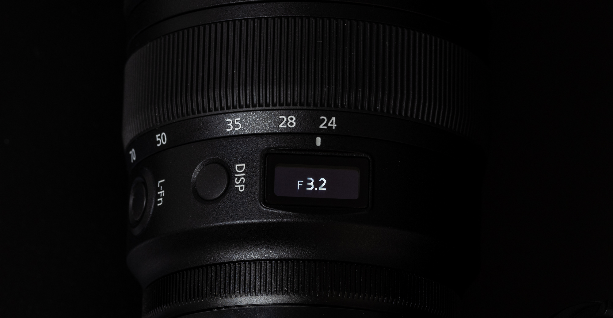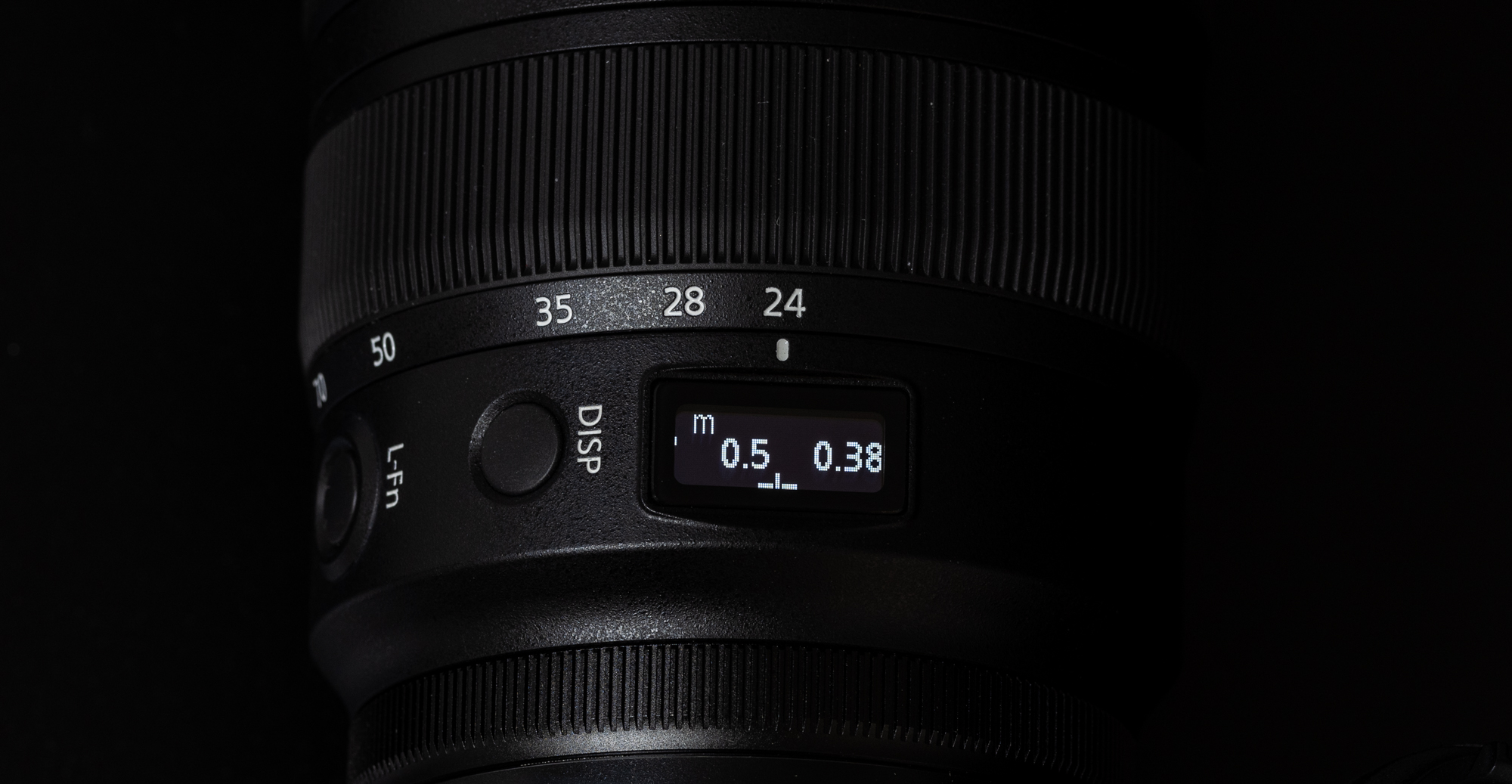 镜头还装有信息面板,可显示焦距、光圈、对焦距离和景深标尺等多种信息,信息切换方式是通过镜头上的DISP按钮来进行的。信息面板并非常亮,需要使用时按下DISP按钮来唤醒。