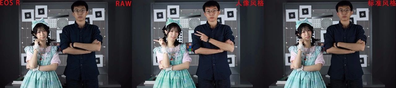 EOS R:与楼上两位索尼选手加起来一起看的话,第一眼看上去颜色好像有点发青。但是如果单独拎出来看的话,会发现机身是为了保持肤色白皙而把白平衡往冷那边调了。但是当年单反的玄学白里透红就没办法重现了。同时曝光上也是偏暗的,虽然妹子那边的曝光算正常,但是我的脸和手臂是彻底黑了(而且还青了)。