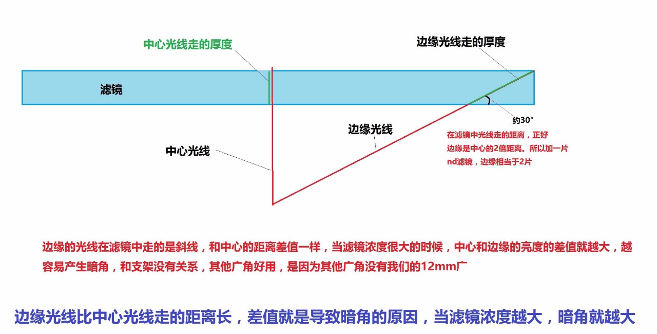 而对于单反上的反望远镜头,出瞳距离焦平面都比较远,近乎于垂直入射,暗角问题相比前置滤镜轻微得多。