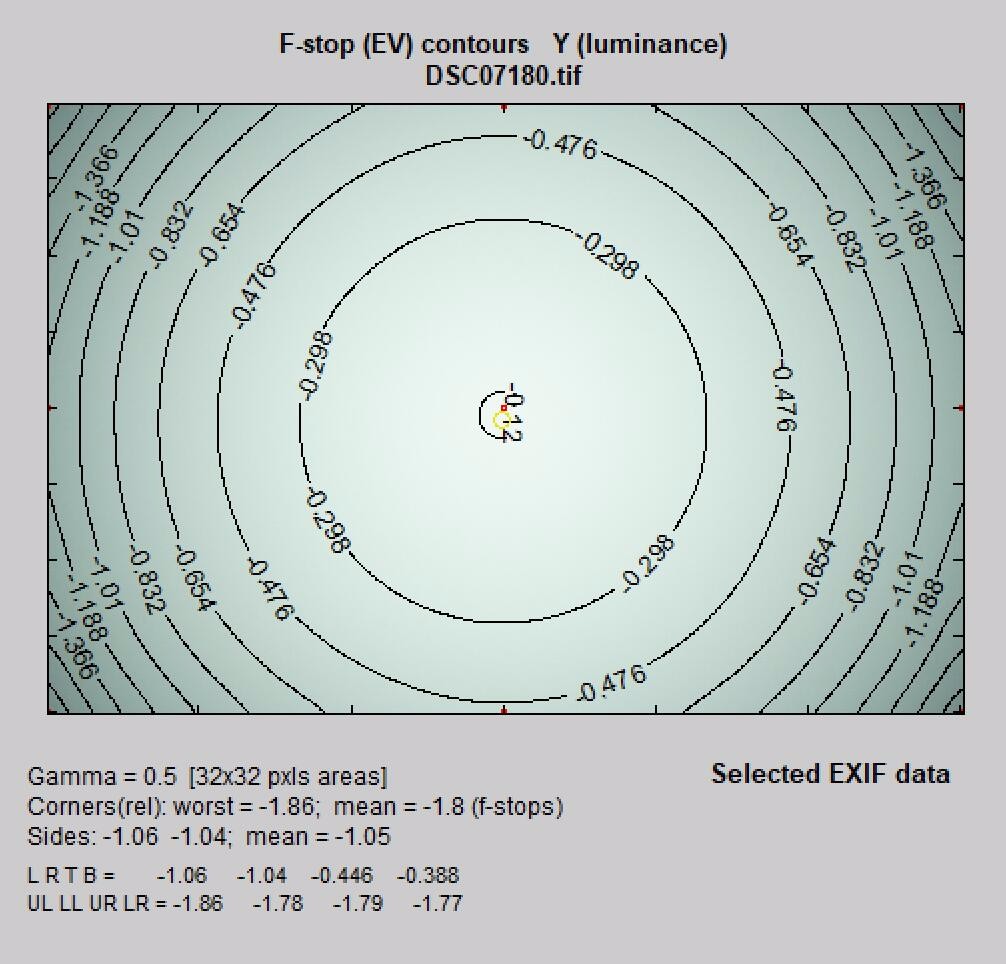 索尼FE 35mm f/1.8 的全开光圈暗角为:1.86EV