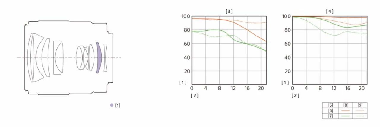 既然是一支普通镜头,用料上相对就没有那么精贵了,镜头结构9组11片,其中有一片非球面镜片抑制相差。镜片整体镀膜呈黄绿色,也是索尼镜头常见的镀膜颜色。