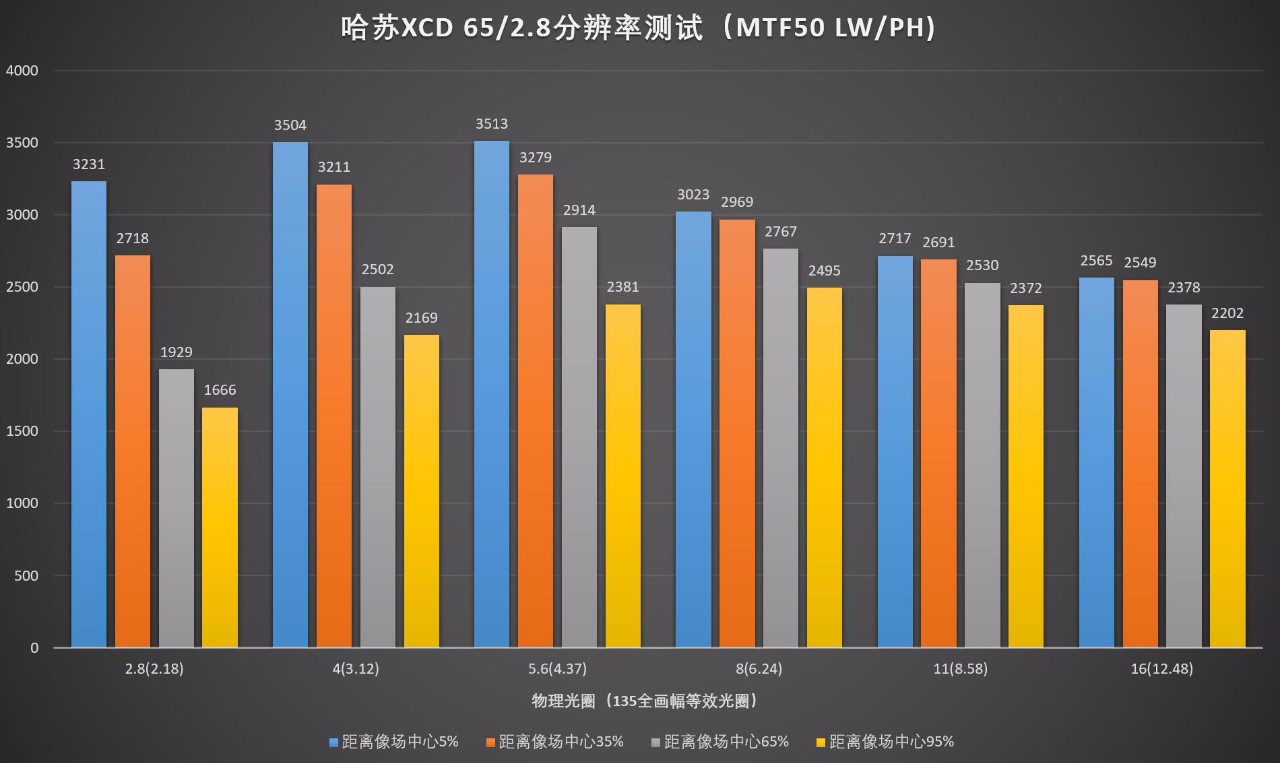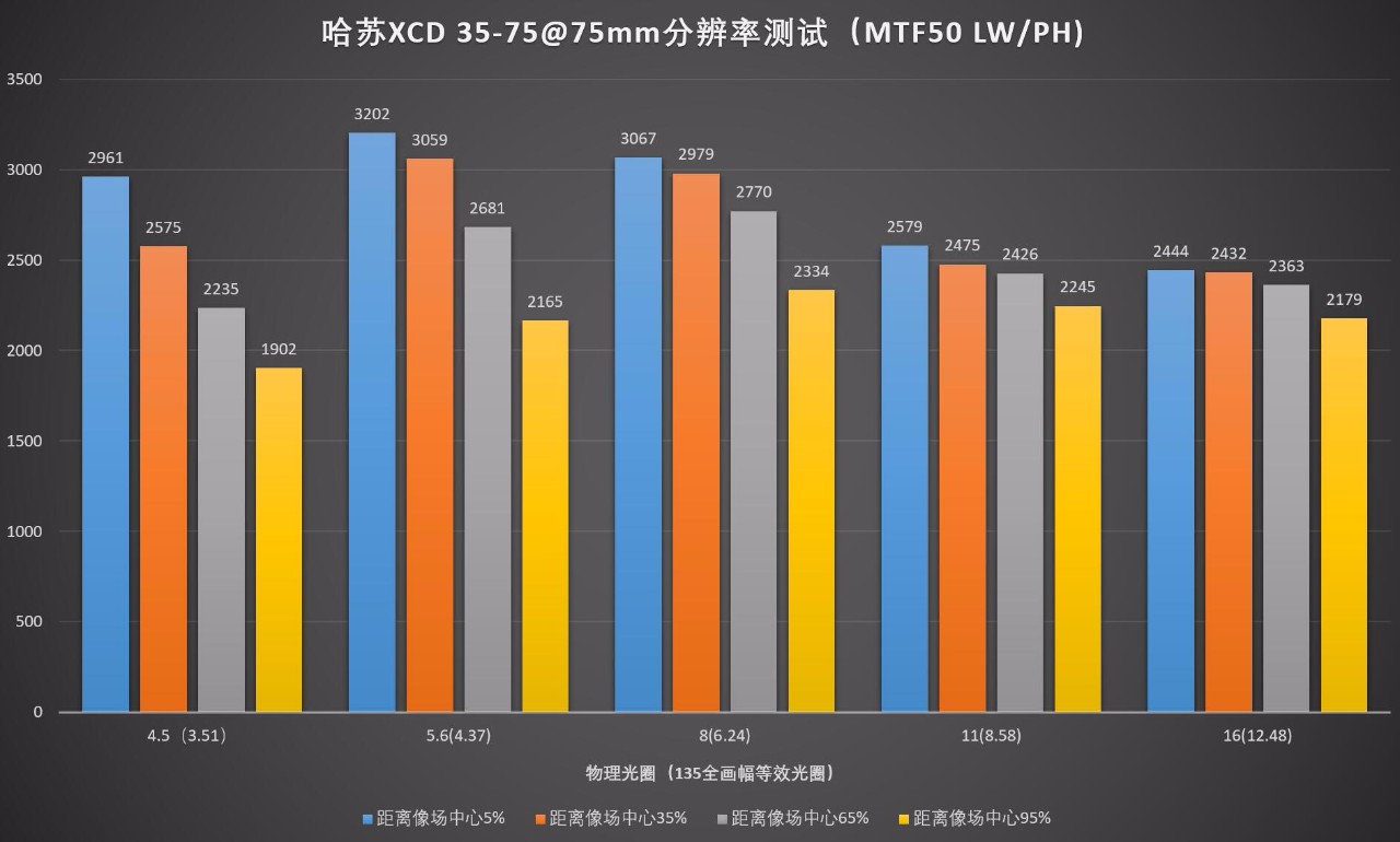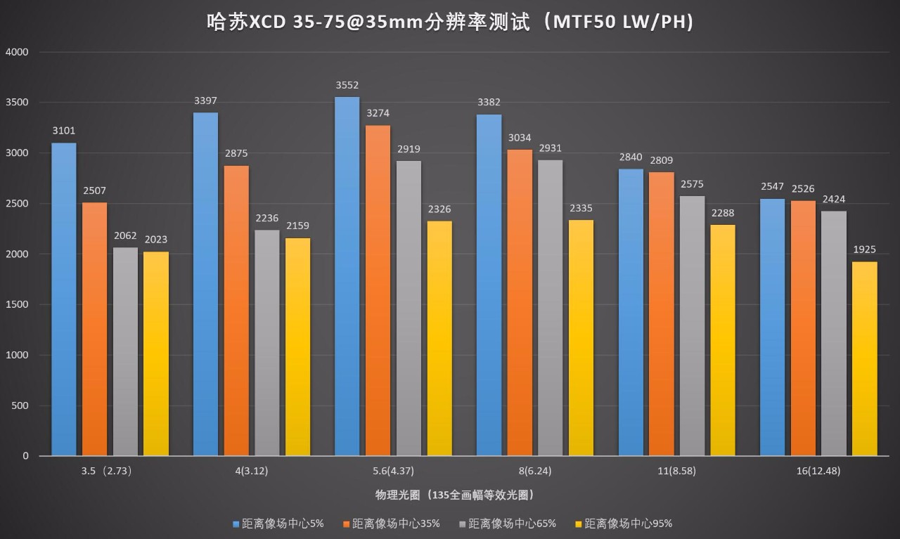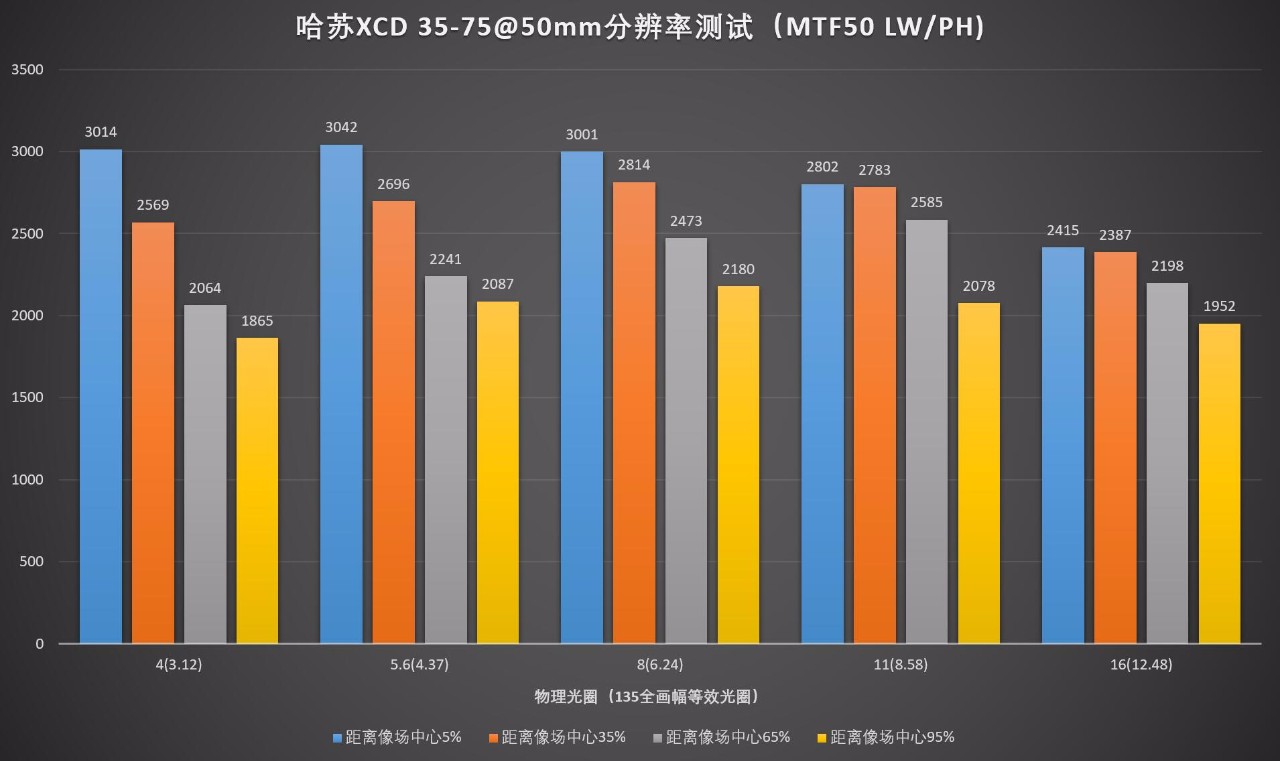 最佳分辨率出现在广角端的f/5.6(4.37)光圈,这个时候的分辨率表现跟上面的XCD 65 2.8极限分辨率基本一致。