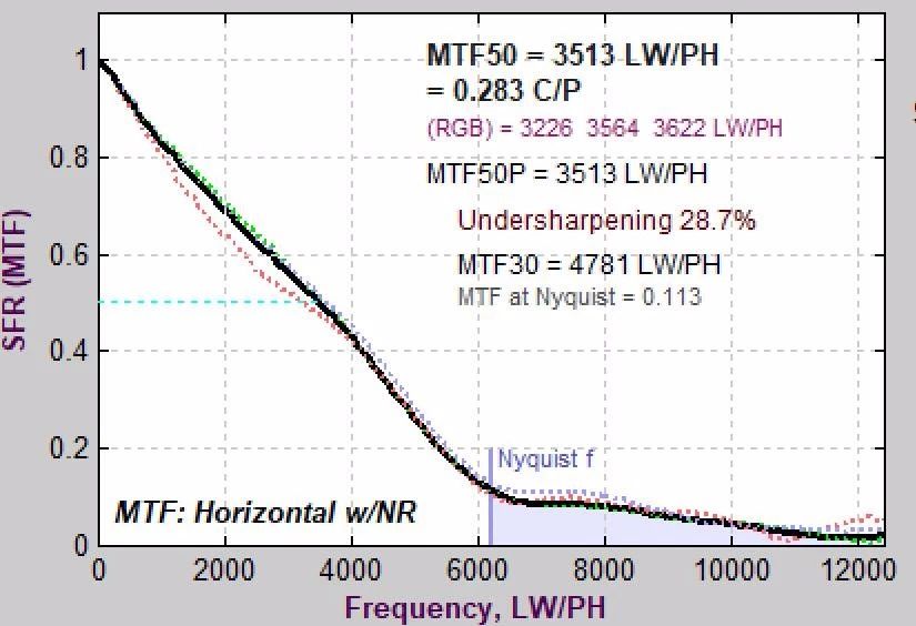 从最佳光圈下这套系统的频率响应特性来看X1D II 50C应该是无低通设计的,在奈奎斯特频率附近依然有大于10%的对比度。这也意味着如果要拍摄织物之类的富纹理题材有可能会在画面当中出现比较明显的摩尔纹或者伪色,需要留意一下。