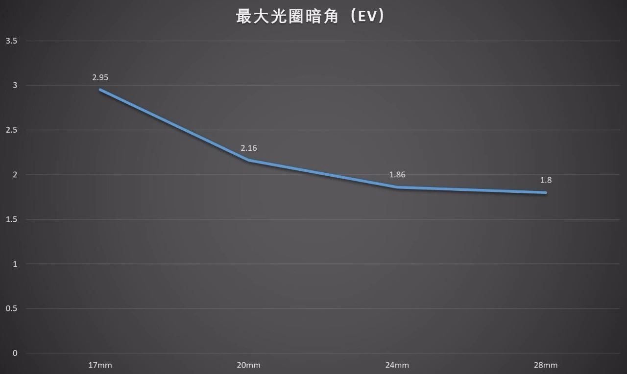 不过28mm端的暗角就轻微很多了,光圈全开下的暗角也不是很大。