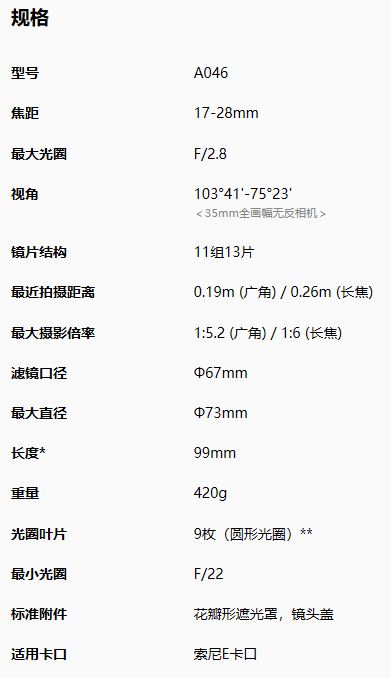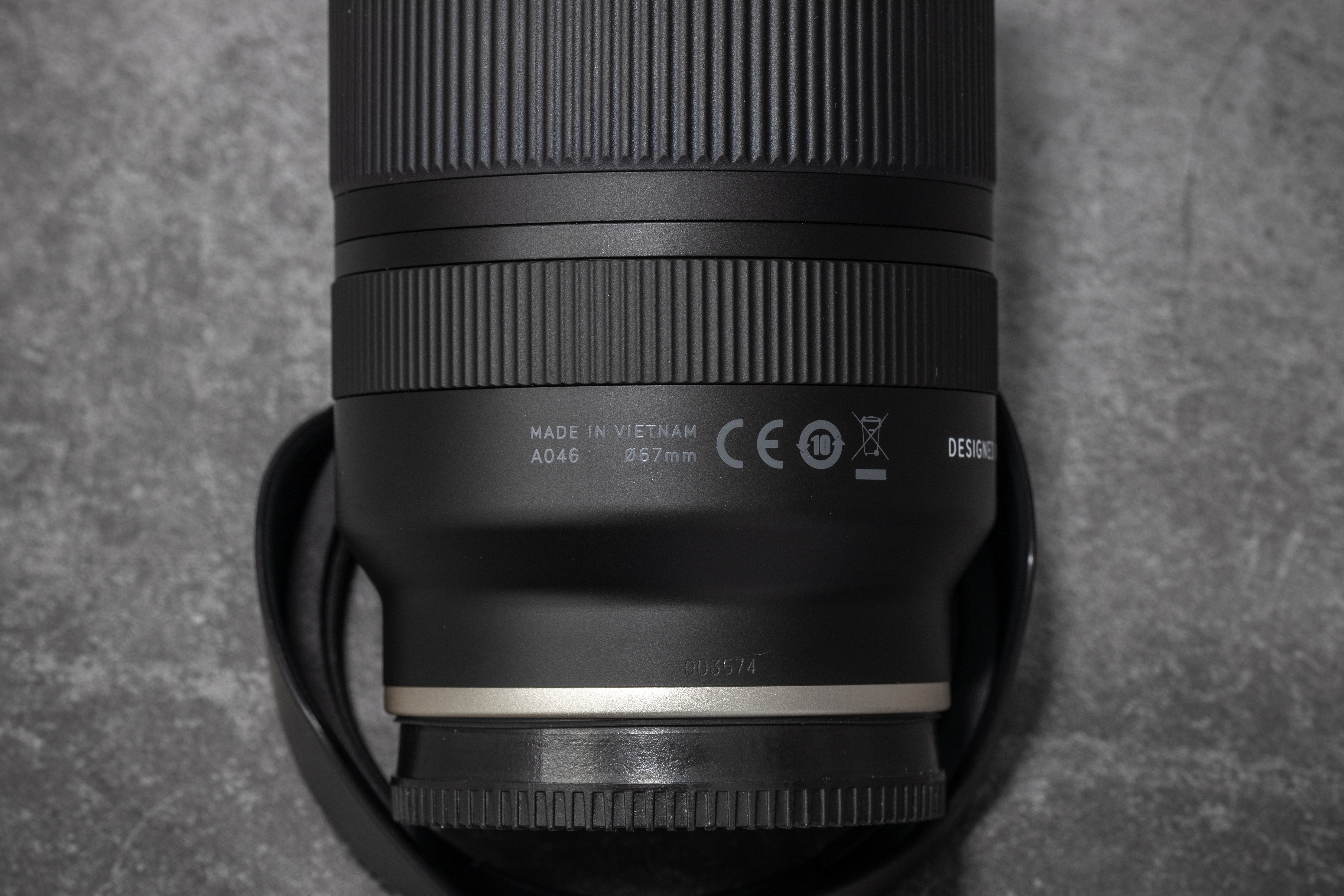 镜头型号A046。滤镜口径67mm,越南制造。 可以大概看到它的直径只比E卡口大一圈,相对于原厂的16-35GM来说的确瘦身不少。但也不是全无代价的,两头的焦距都缩了水,没有那么广,也没有那么长。