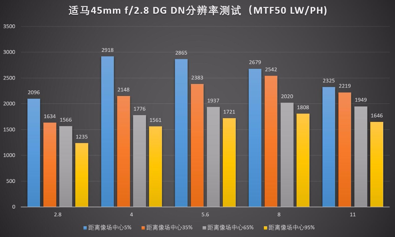 从整体上来看这支镜头的分辨率表现还不错,虽然规格有所短但各个光圈和区域的标板跑分都还是可以的。但针对这支镜头我这里没有做对于实际使用向的标板成绩点评,是由于这支镜头存在一个非常明显的特异情况——由于针对性的进行了球面像差保留(适马官方称),不同对焦距离下的分辨率大相径庭,标板工作距离的测试难以反映大部分情况下的实拍体验。在后面的实际拍摄测试当中会具体的展示和讨论这个问题,当然标板测试成绩肯定还是要放出来的,供大家参考(标板拍摄工作距离约2.5米)。